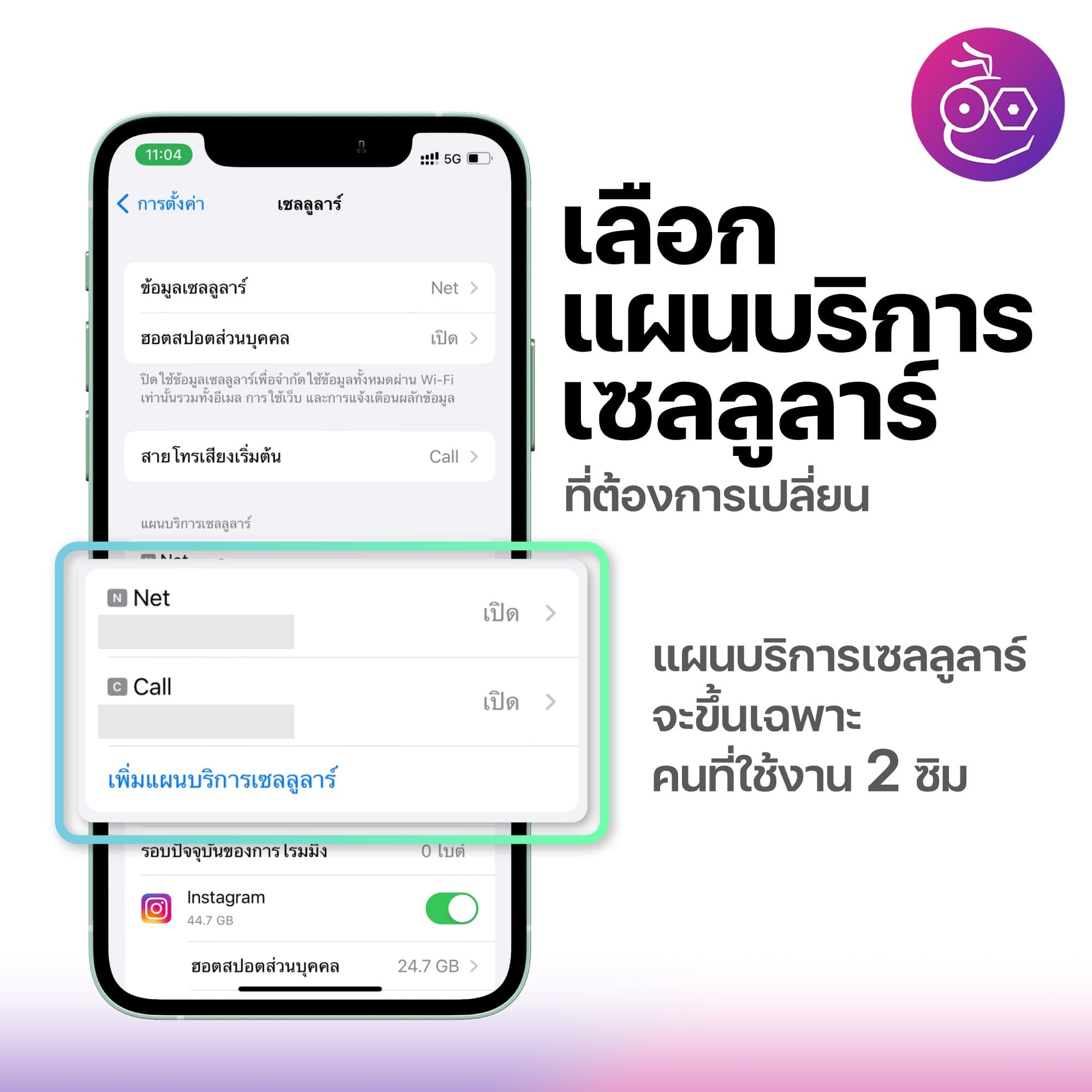 ตรงส่วนแผนบริการเซลลูลาร์ (Cellular Plan) จะมีซิมให้เลือกตั้งค่า 2 ซิม (หากใช้ซิมเดียวจะไม่ขึ้น)