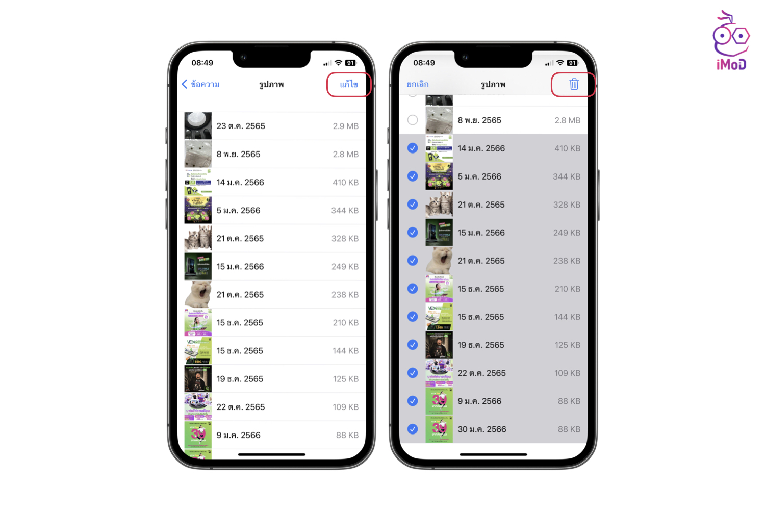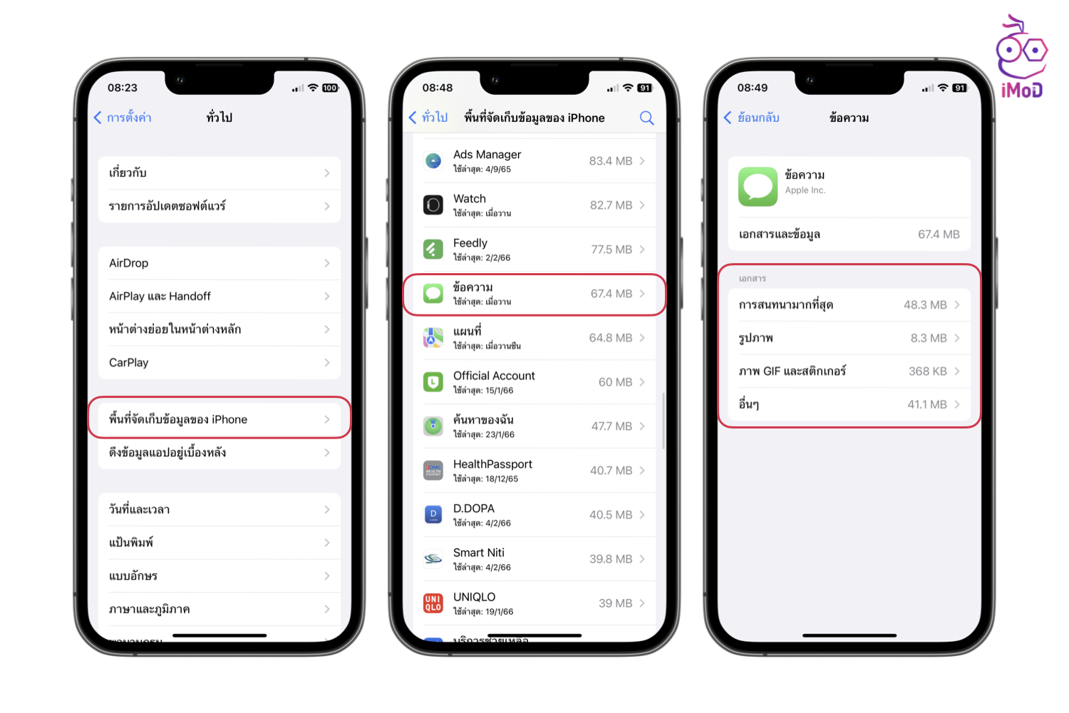 ไปที่ การตั้งค่า (Settings) > ทั่วไป (General) > พื้นที่จัดเก็บข้อมูล iPhone > ข้อความ (Message) > แตะเลือกข้อมูลที่ต้องการเคลียร์ ตัวอย่างเลือก รูปภาพขบย