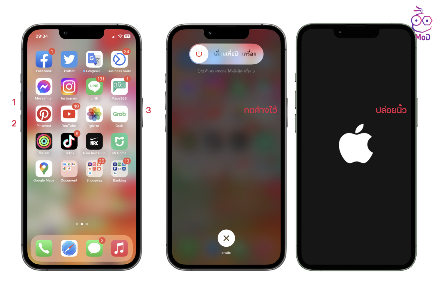 วิธีการบังคับรีสตาร์ต iPhone (Force) จะช่วยล้างแคชและลบไฟลชั่วคราว (Temporary File) บางส่วนออกได้ มีวิธีดังนี้