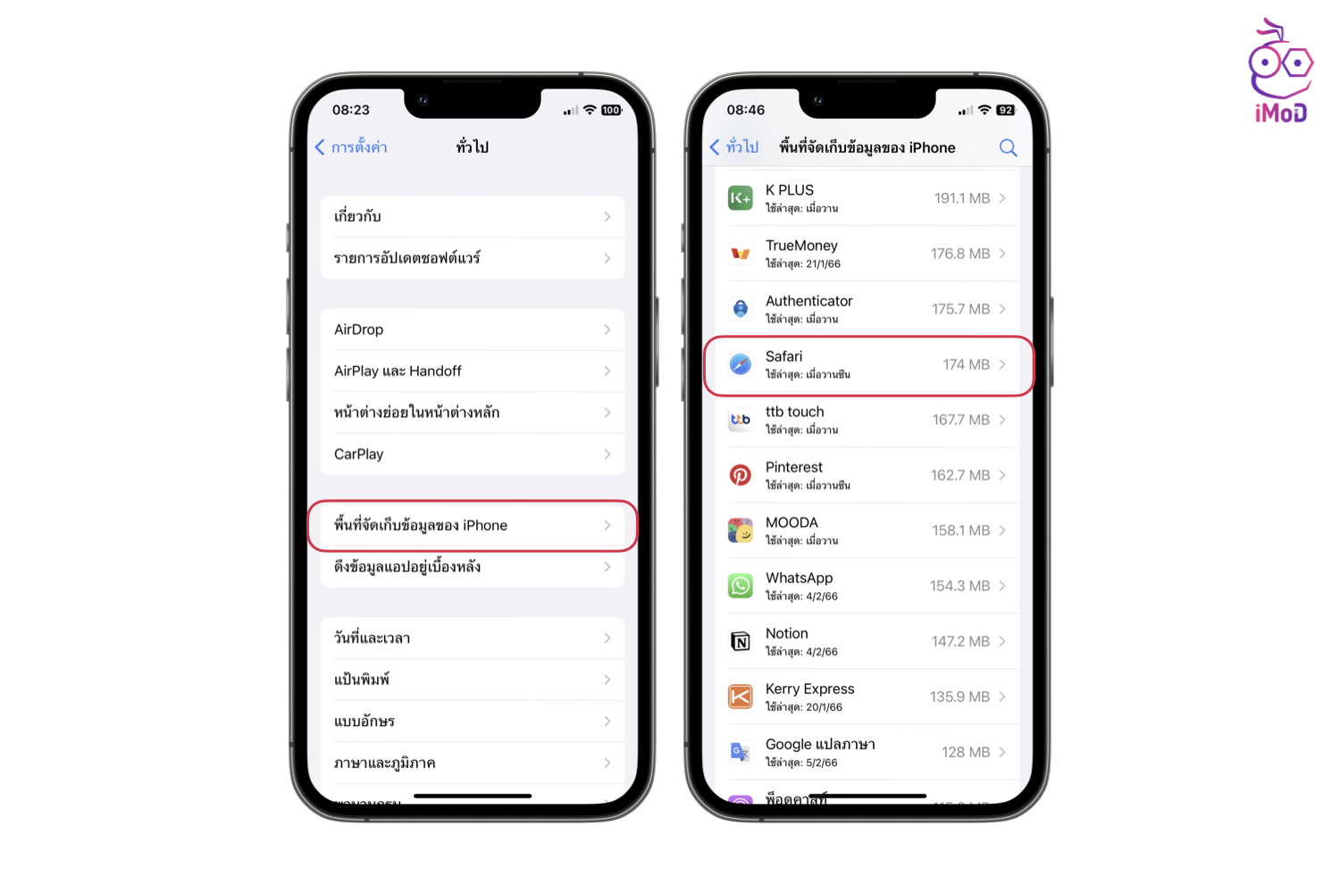 ไปที่ การตั้งค่า (Settings) > ทั่วไป (General) > พื้นที่จัดเก็บข้อมูล iPhone > Safari