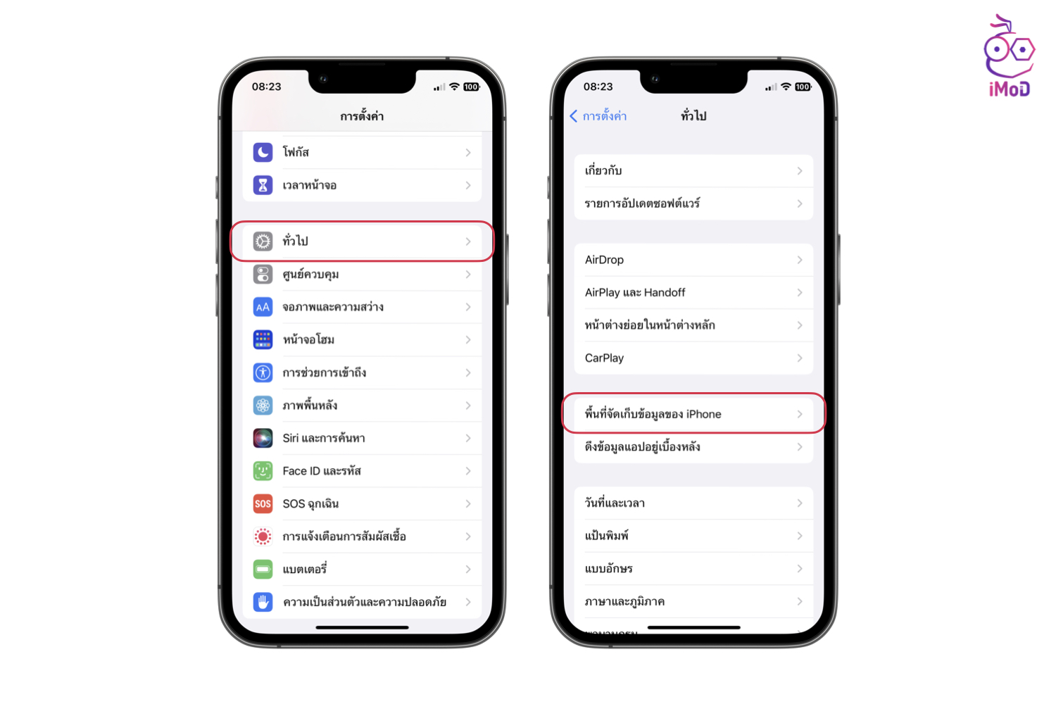 ไปที่ การตั้งค่า (Settings) > ทั่วไป (General) > พื้นที่จัดเก็บข้อมูล iPhone, iPad (iPhone, iPad Storage)