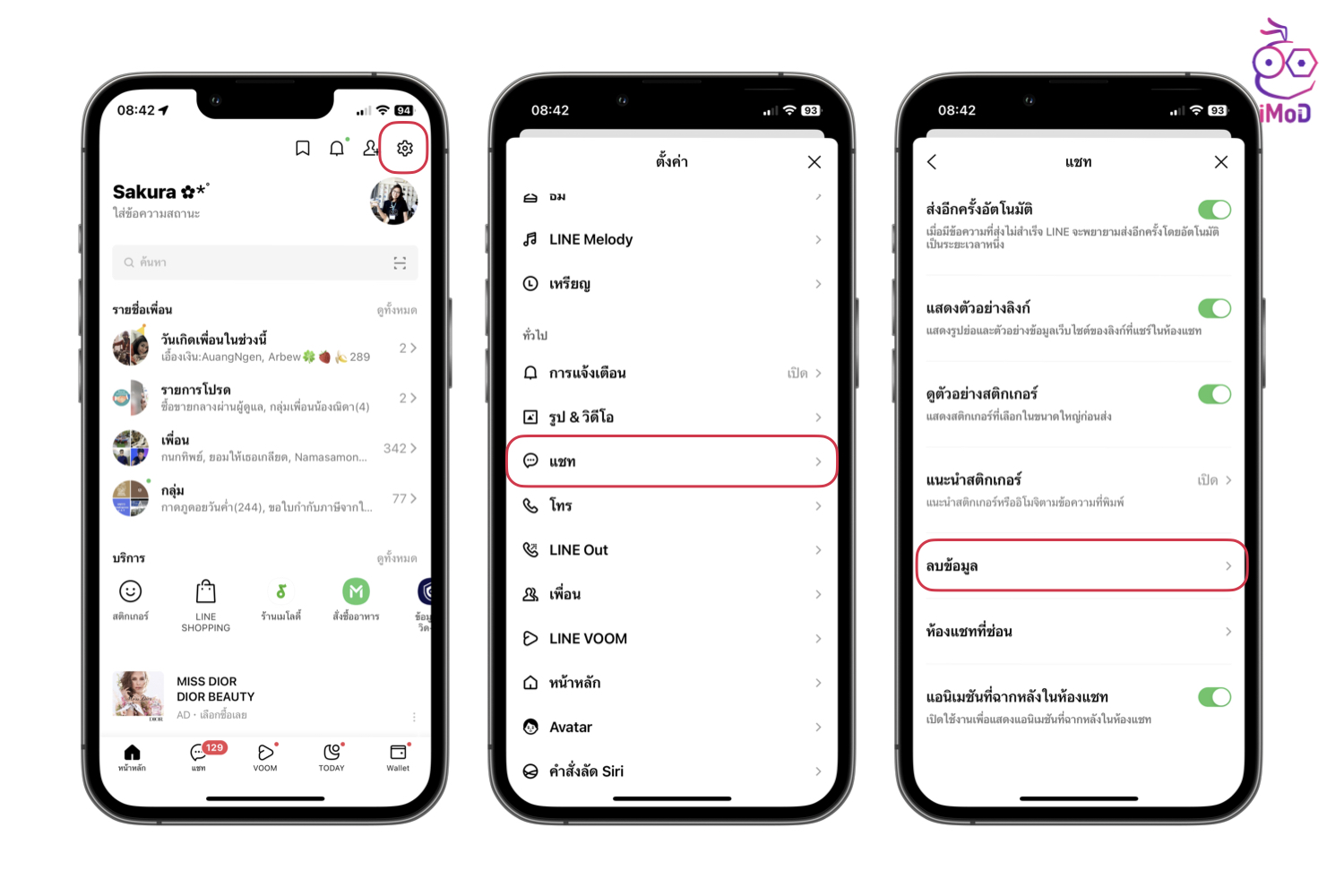 ไปที่แอป LINE > หน้าโฮม ให้เลือกไอคอนการตั้งค่า ด้านบนมุมขวา > แตะ แชท > แตะ ลบข้อมูล