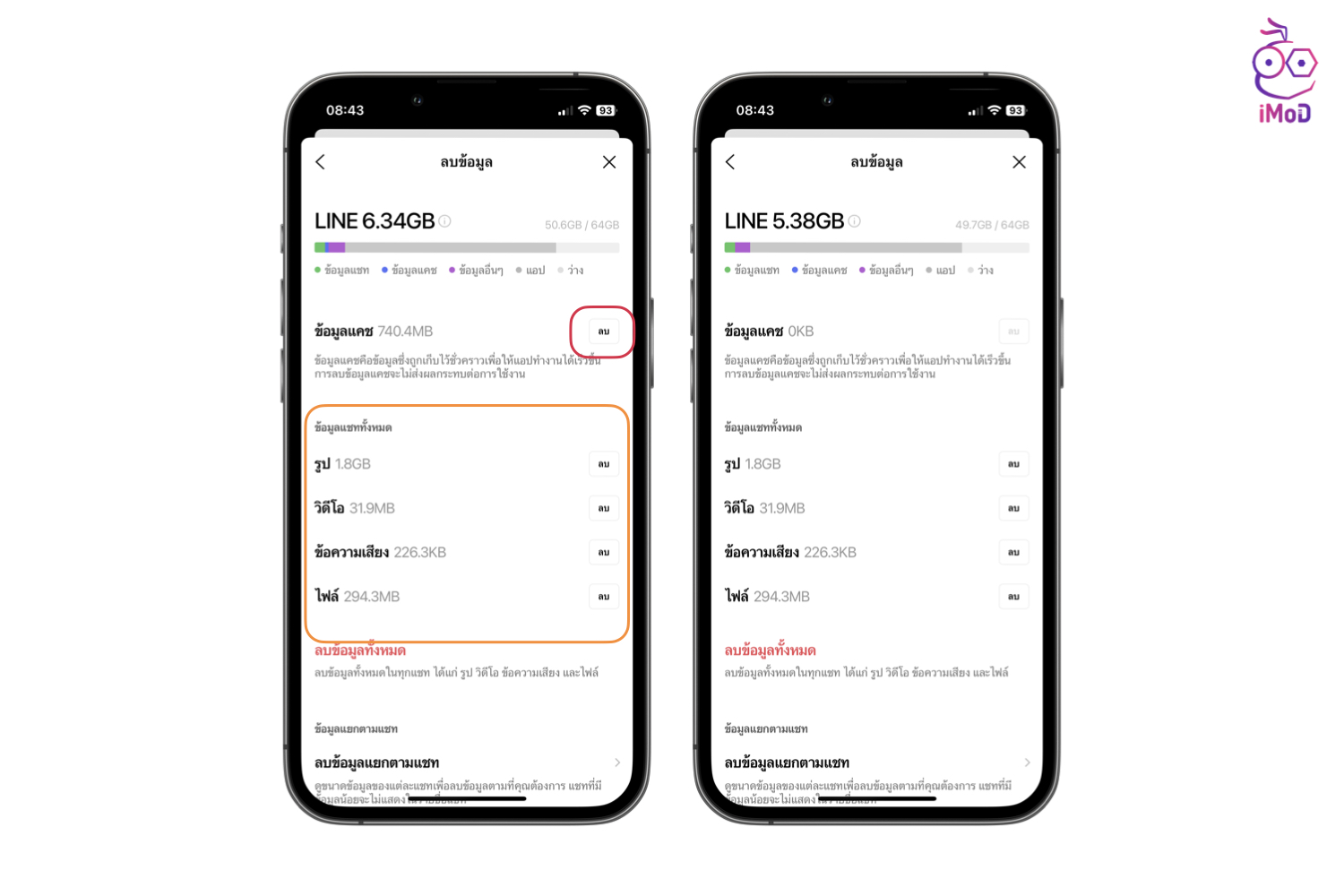 แตะ ลบ ที่ข้อมูลแคช (หากเราต้องการเคลียร์รูปภาพ วิดีโอ ข้อความเสียง ไลฟ์ต่าง ๆ ที่ส่งหากันผ่านไลน์ ก็อาจจะเลือกลบไปได้เลย แต่ถ้าไฟล์เหล่านี้จำเป็นจะต้องใช้งานและดูอยู่ก็ไม่ต้องลบ เคลียร์เฉพาะแคชเท่านั้น)