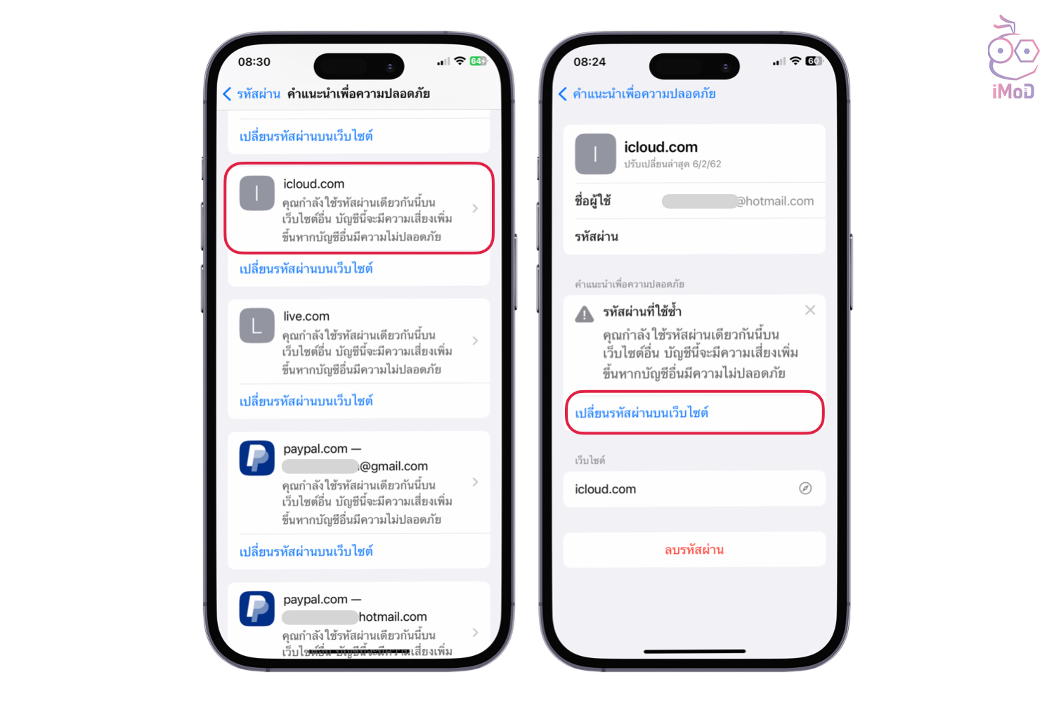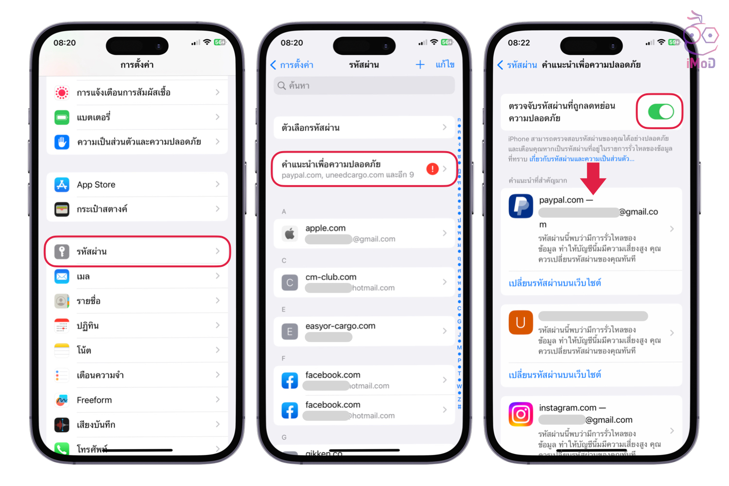 ไปที่ การตั้งค่า (Settings) > รหัสผ่าน (Passwords) > หากรหัสผ่านเรามีความเสี่ยงด้านความปลอดภัย เราจะพบส่วนของ คำแนะนำเพื่อความปลอดภัย (Security Recommendation) > แนะนำให้เปิด ตรวจจับรหัสผ่านที่ถูกลดหย่อนความปลอดภัย (Detect Compromised Passwords) เพื่อให้เครื่องตรวจสอบรหัสผ่านที่มีความเสี่ยงเสมอ > จากนั้น ดูส่วนรายการบัญชีและรหัสผ่านด้านล่าง ว่ามีบัญชีไหนที่มีความเสี่ยงด้านความปลอดภัยบ้าง และมีความเสี่ยงเรื่องอะไร