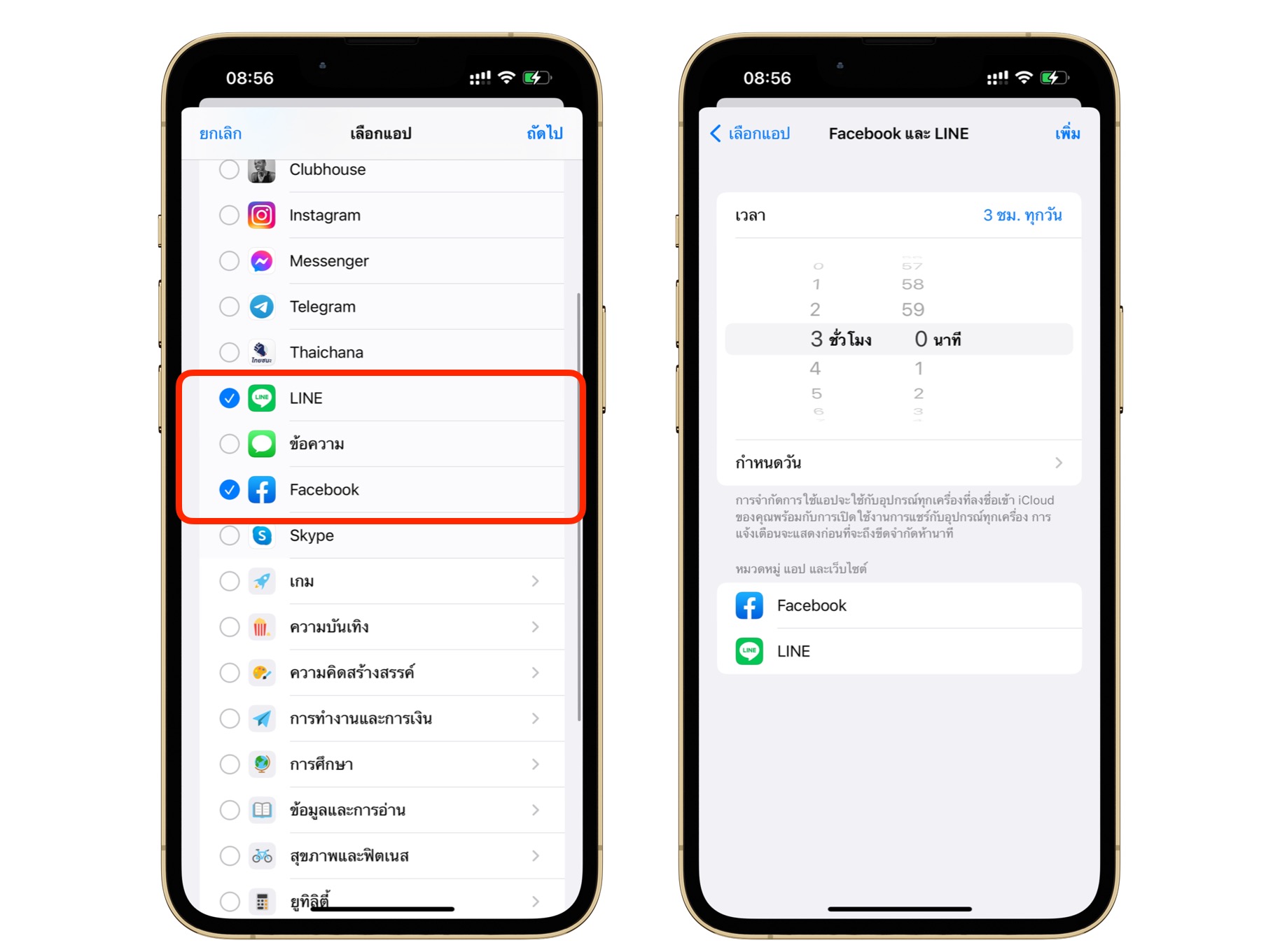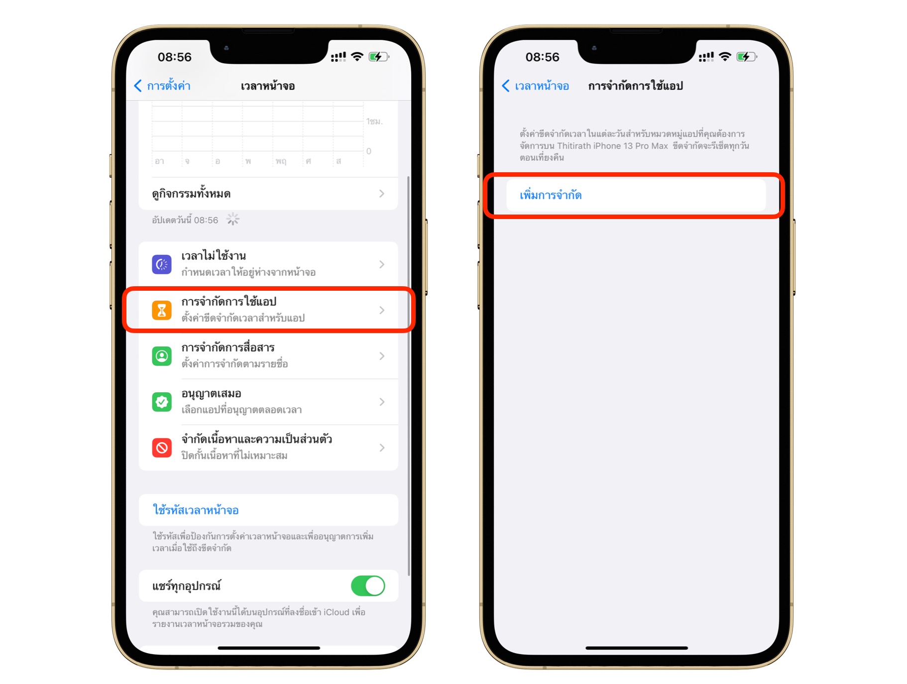 เลือกแอปที่ต้องการจำกัดเวลาใช้งาน > เลือกเวลา กำหนดวัน ที่เราต้องการจำกัด > เสร็จแล้วแตะเพิ่ม