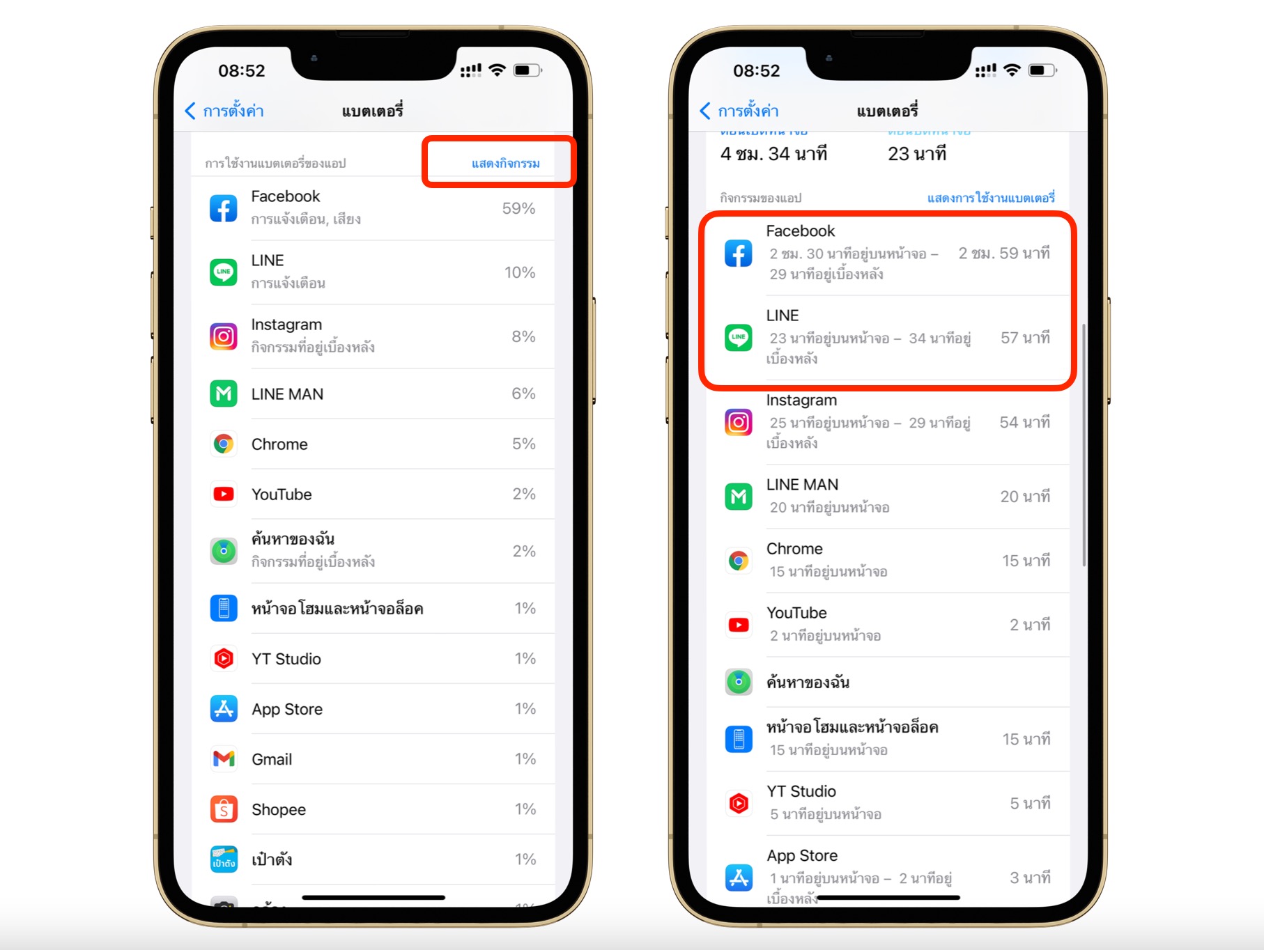 แตะ ‘แสดงกิจกรรม’ เพื่อดูว่ากิจกรรมของแต่ละแอป ใช้เวลาทำงานบนหน้าจอและทำงานเบื้องหลังกี่ชั่วโมง กี่นาที