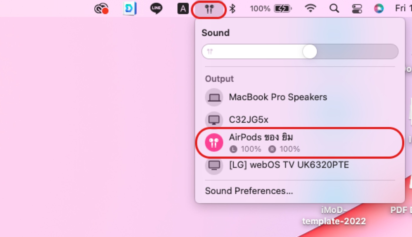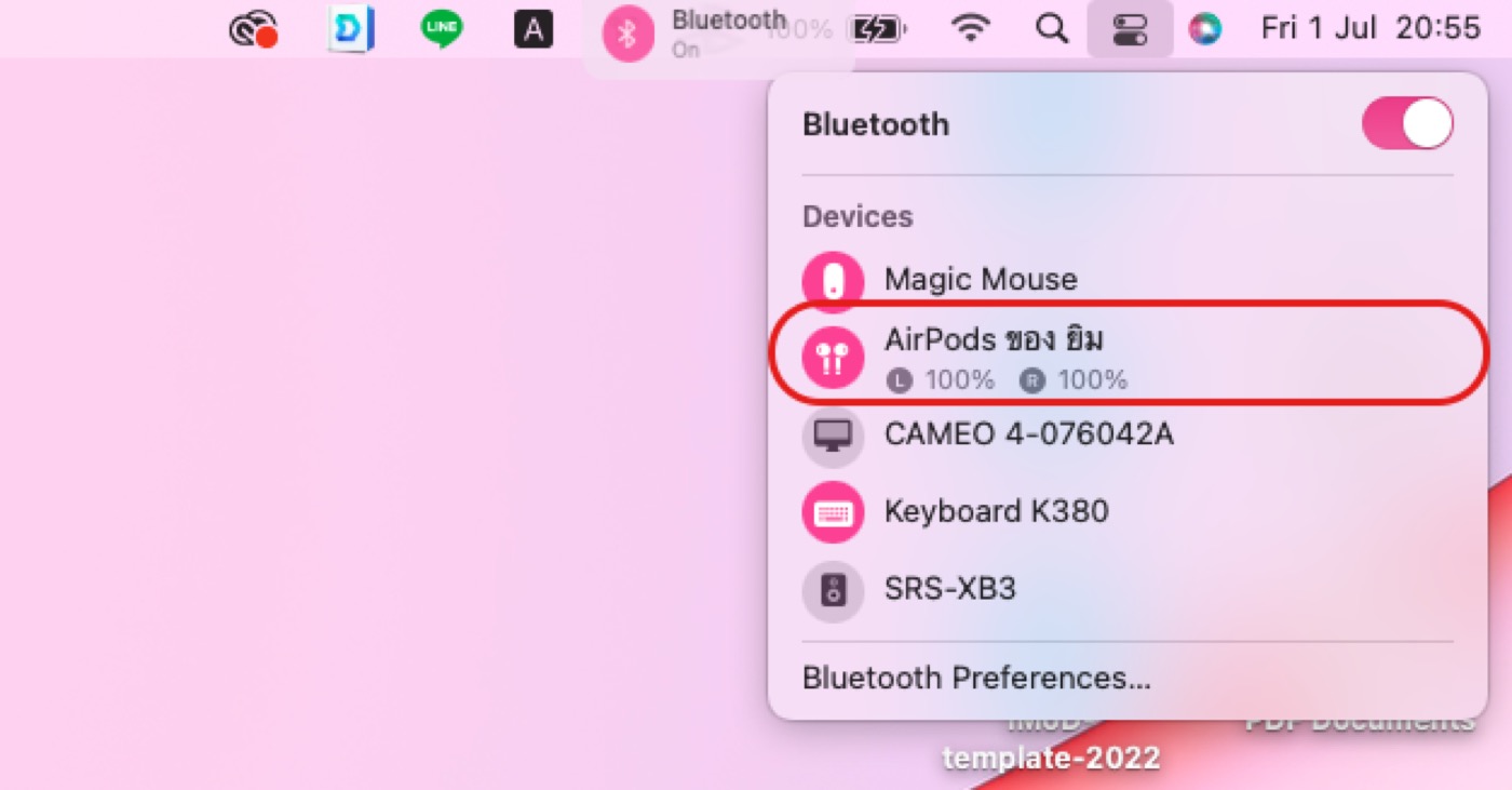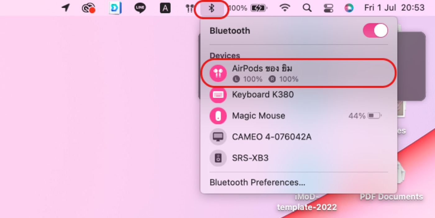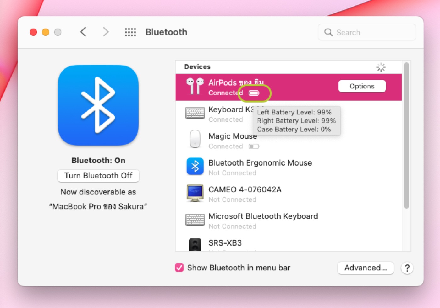 หรือจะเช็คผ่านส่วนของ Bluetooth บน Menu Bar ก็จะได้ โดยดูในส่วนของ AirPods ที่เชื่อมต่อ