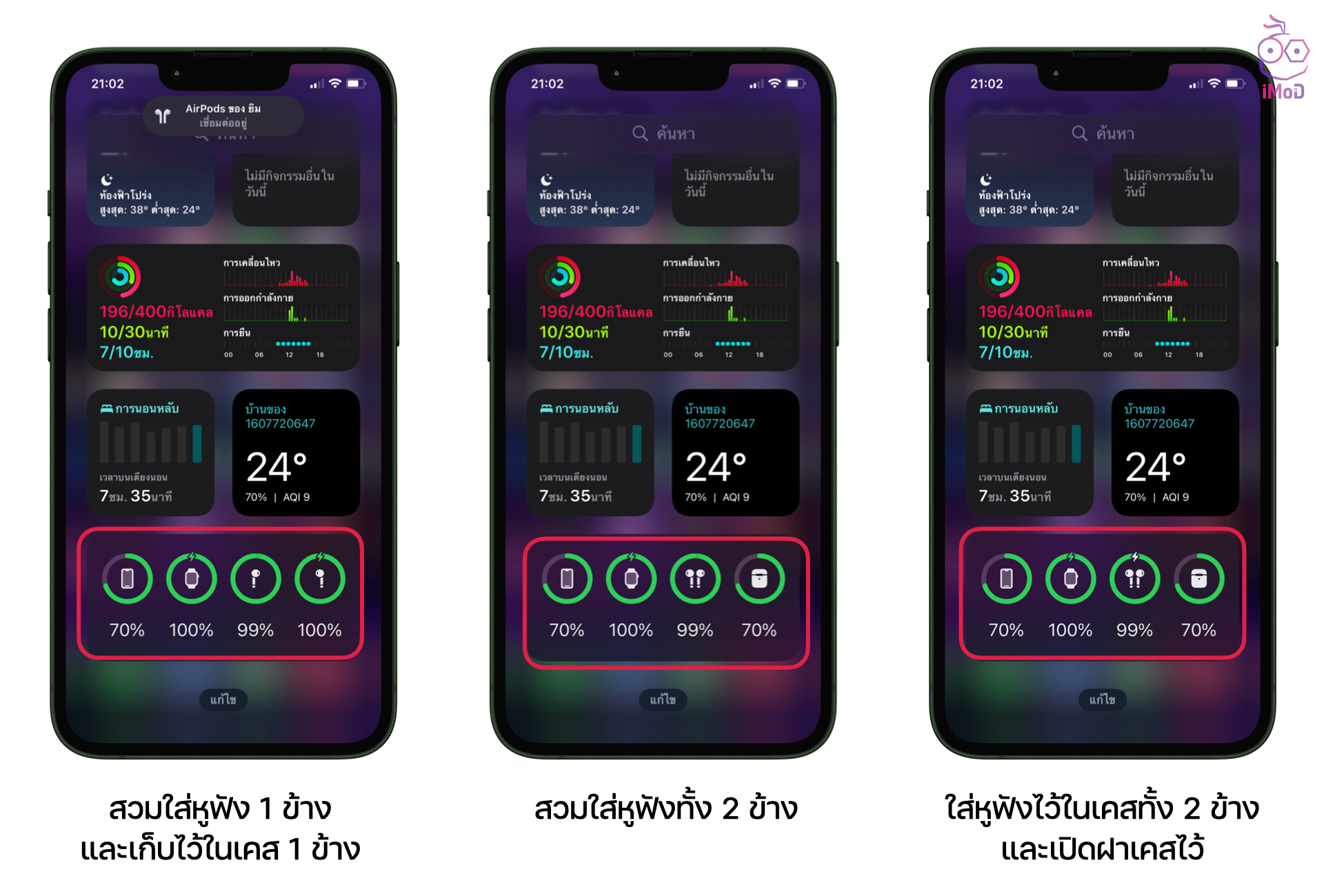 นอกจากนี้เรายังสามารถเช็คแบตเตอรี่ของ AirPods รวมถึงเคสในส่วนของวิดเจ็ตบน iPhone เครื่องที่จับคู่กับหูฟังได้ด้วย โดยจะแสดงเปอร์เซ็ตแบตเตอรี่ดังรูปภาพ