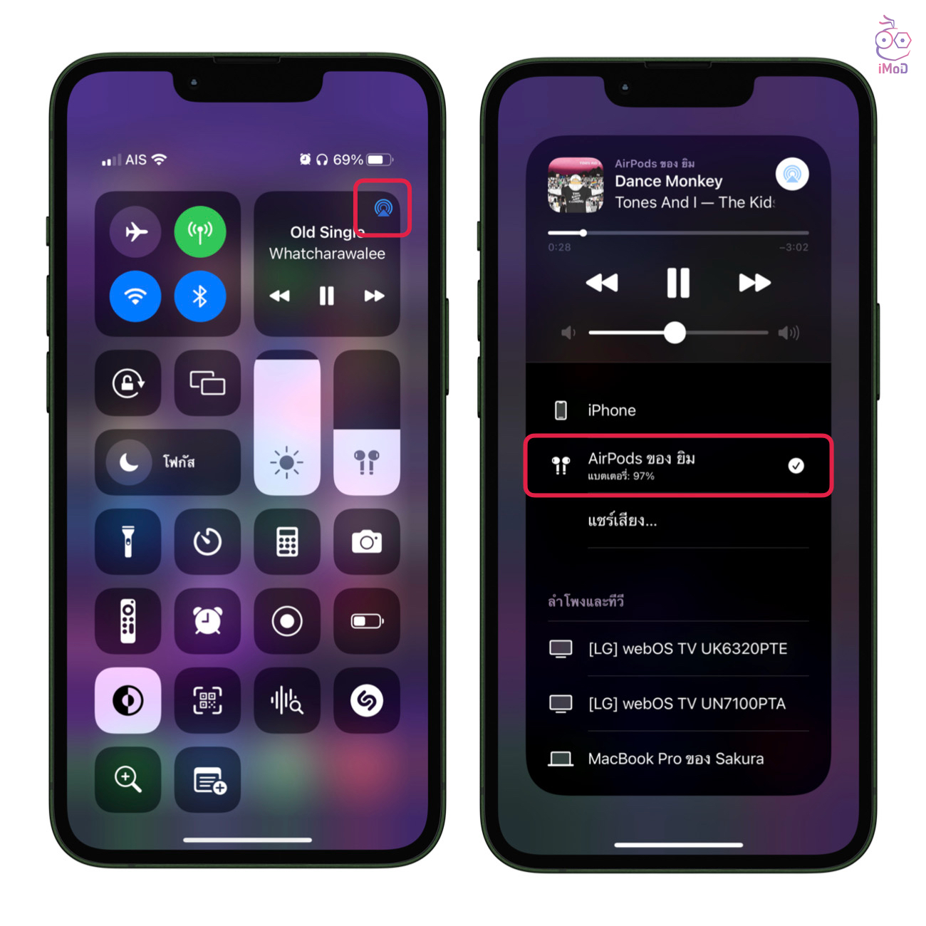 สำหรับใครที่สะดวกเช็คผ่าน Now Playing ที่กำลังเล่นมีเดียอยู่ ก็สามารถปัด Control Center บน iPhone ลงมา แล้วแตะไอคอน AirPlay จากนั้นก็ดูเปอร์เซ็นต์แบตเตอรี่ของ AirPods ที่เชื่อมต่อได้เลย