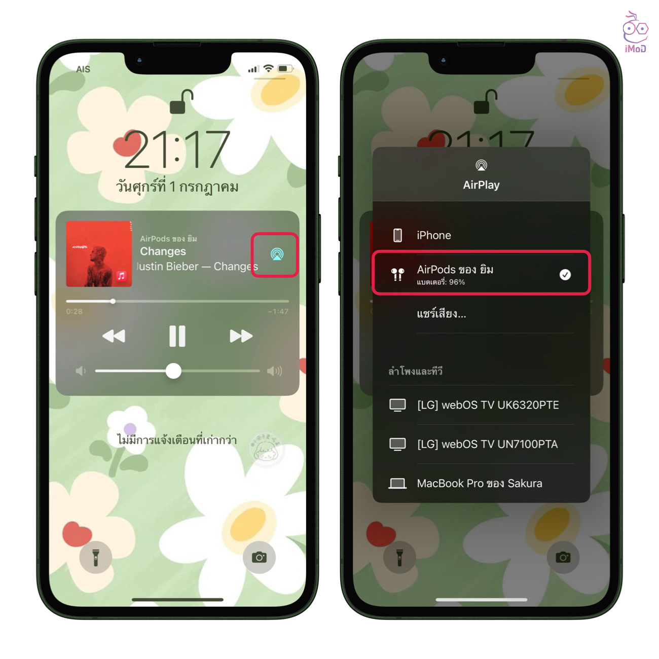 หรือถ้าเราอยู่ในหน้าจอล็อค แล้วกำลังเล่นมีเดียอยู่ ก็สามารถแตะไอคอน AirPlay เพื่อเรียกดูเปอร์เซ็นต์แบตเตอรี่ AirPods ได้เลย