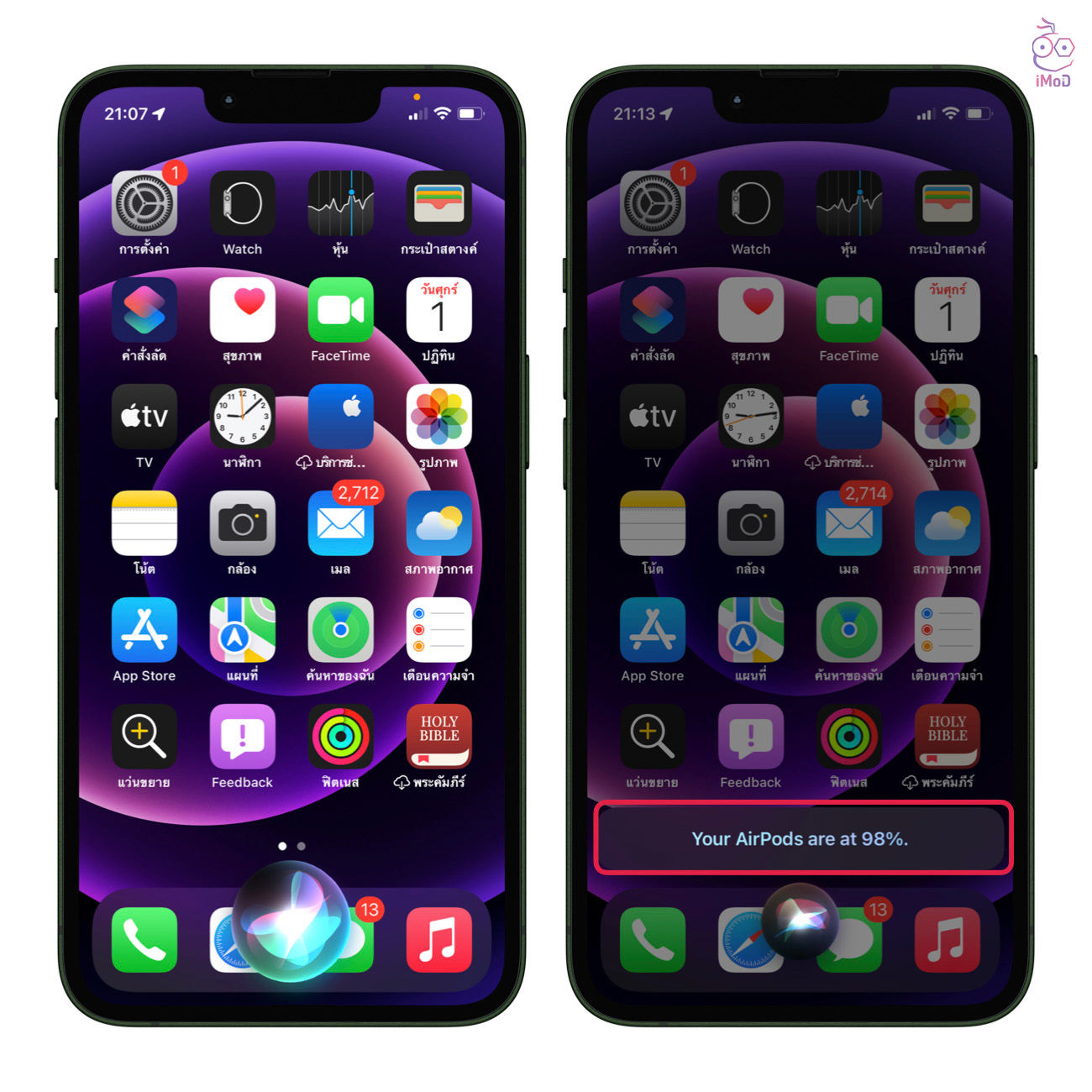 วิธีที่ง่ายอีกหนึ่งวิธีคือการถาม Siri เพียงแค่เรียก Siri ขึ้นมาโดยเรียก หวัดดี Siri หรือกดปุ่มด้านข้างค้างไว้ จนไอคอน Siri แสดงขึ้นมา แล้วถามว่า แบตเตอรี่ AirPods ของฉันเหลือเท่าไหร่ (How’s the battery on my AirPods) Siri ก็จะบอกเปอร์เซ็นต์แบตเตอรี่คงเหลือทันที