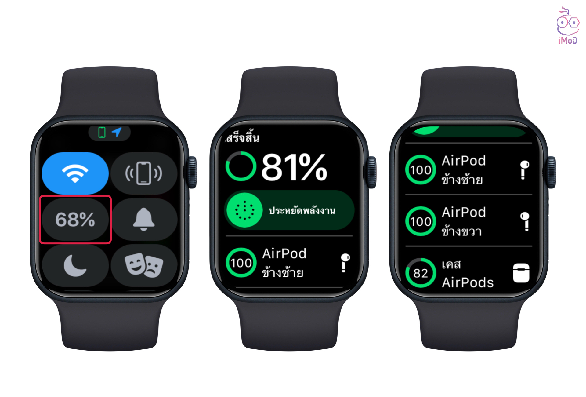 หากเราเชื่อมต่อ AirPods กับ Apple Watch โดยตรง ก็สามารถเช็คเปอร์เซ็นต์แบตเตอรี่ของ AirPods บนข้อมือได้ เพียงแค่ปัด Control Center ขึ้นมา จากนั้นก็แตะส่วนแบตเตอรี่ แล้วเลื่อนลงด้านล่าง เพื่อดูแบตเตอรี่ของ AirPods ได้เลย