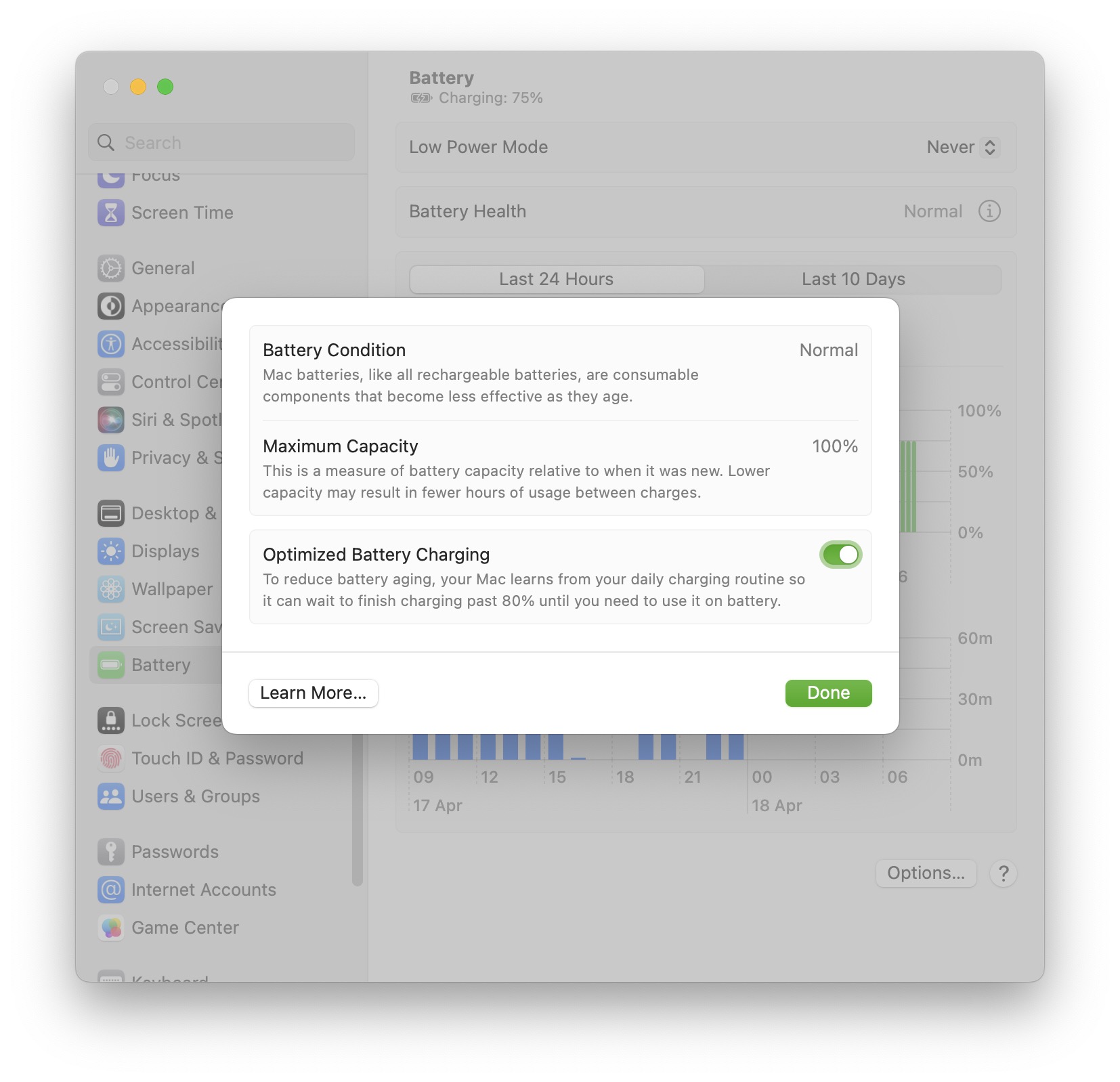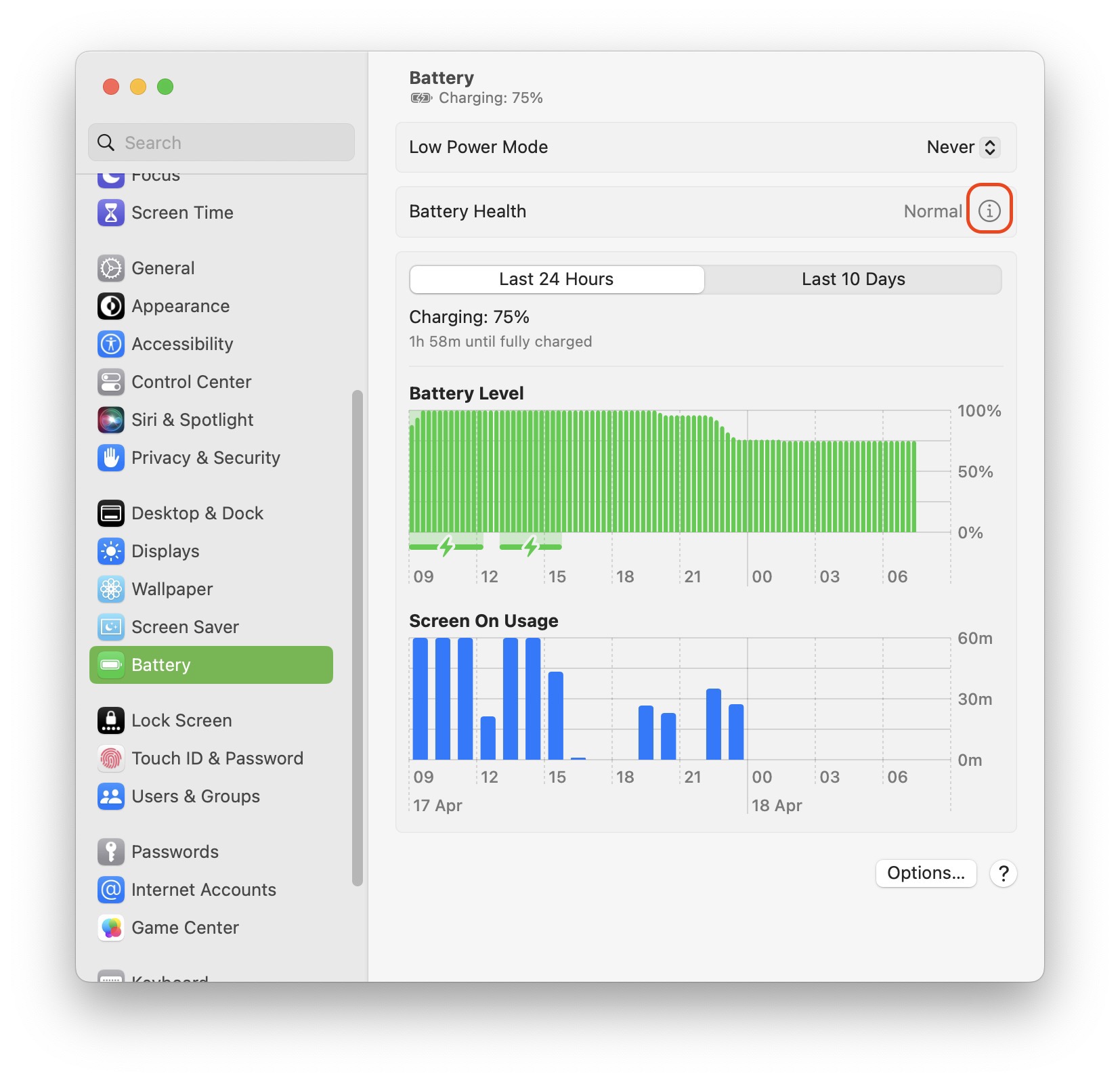 นอกจากนี้ เรายังสามารถเช็คสุขภาพแบตเตอรี่ได้โดย ไปที่ System Settings > Battery > คลิกไอคอน i ที่ Battery Health