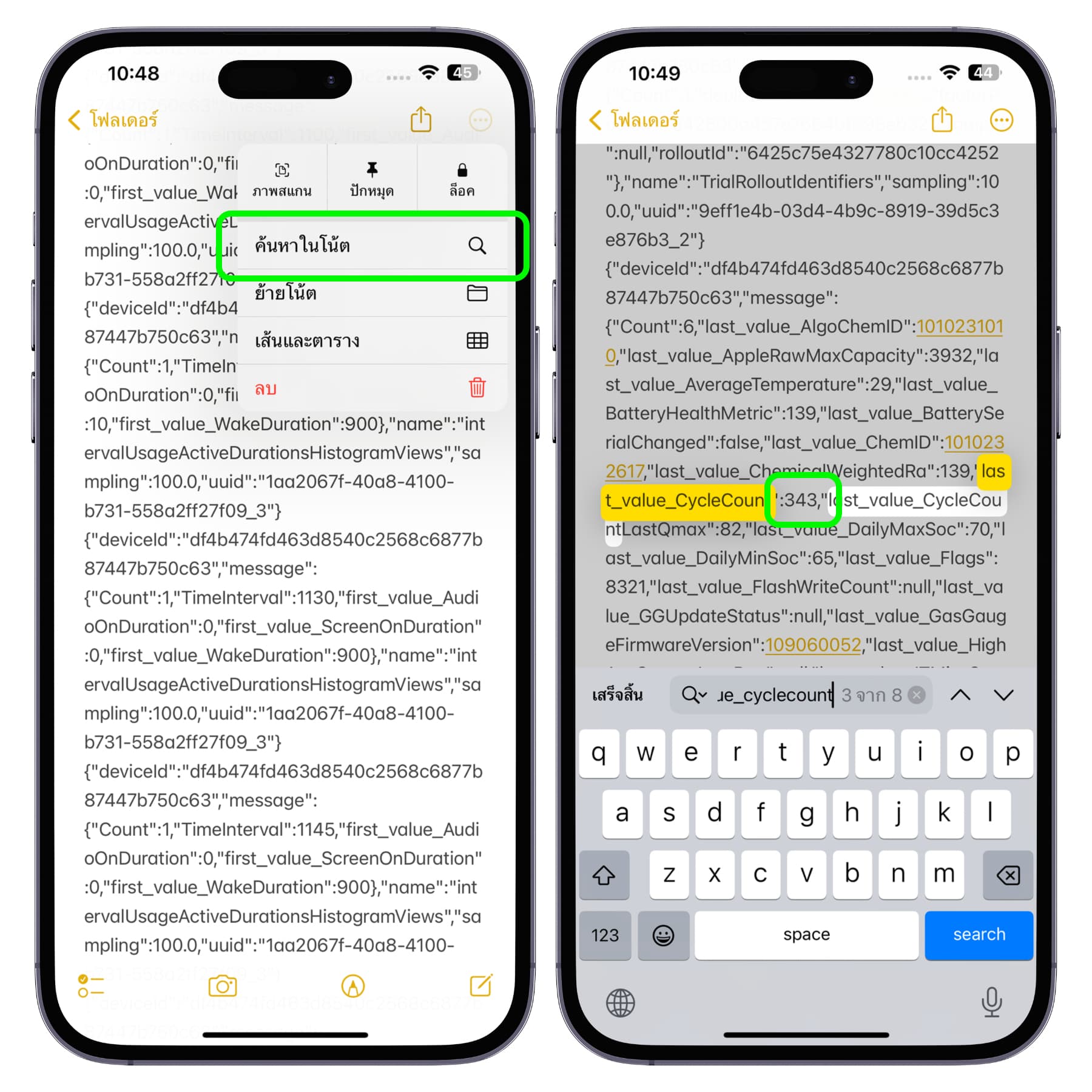 จากนั้นเราจะเห็นตัวเลขปรากฏใกล้ ๆ คำที่เราค้นหา อย่างในตัวอย่างจะได้ตัวเลข “343” ซึ่งก็คือจำนวนรอบการชาร์จที่เราใช้ ใช้ไปทั้งหมด 343 รอบการชาร์จนั่นเอง