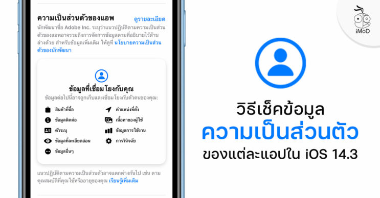 ใน iOS 14.3 ทาง Apple ได้เริ่มปล่อยการแสดงข้อมูลความเป็นส่วนตัว (App Privacy) ของแอปต่าง ๆ บน App Store ทั้งแอปของ Apple และ Thrid Party เพื่อให้ผู้ใช้ทราบว่าแอปเชื่อมโยงข้อมูลอะไรบ้าง ก่อนที่จะทำการดาวน์โหลดแอป มาดูกันว่าสามารถเช็คข้อมูลความเป็นส่วนตัวอย่างไร