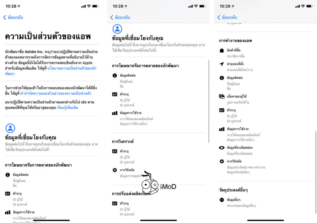 เมื่อแตะดูรายละเอียด ก็จะพบกับข้อมูลต่าง ๆ ที่แอปเชื่อมโยงกับข้อมูลของเรา ทั้งการโฆษณา การวิเคราะห์ การทำงานของแอป การปรับแต่งผลิตภัณฑ์ และข้อมูลอื่น ๆ
