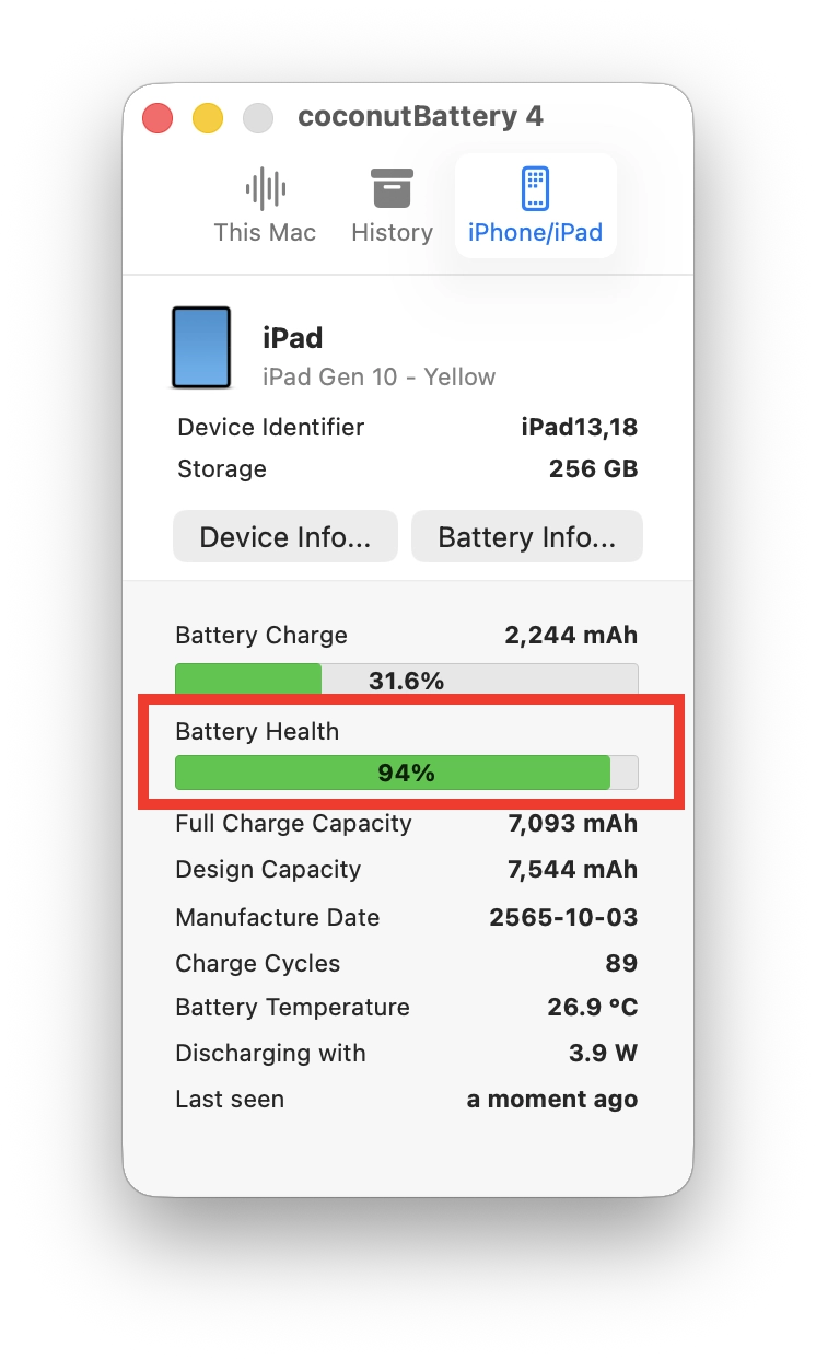 เปิดแอป coconutBattery บน Mac > สุขภาพแบต iPad จะแสดงตรงส่วน Battery Health