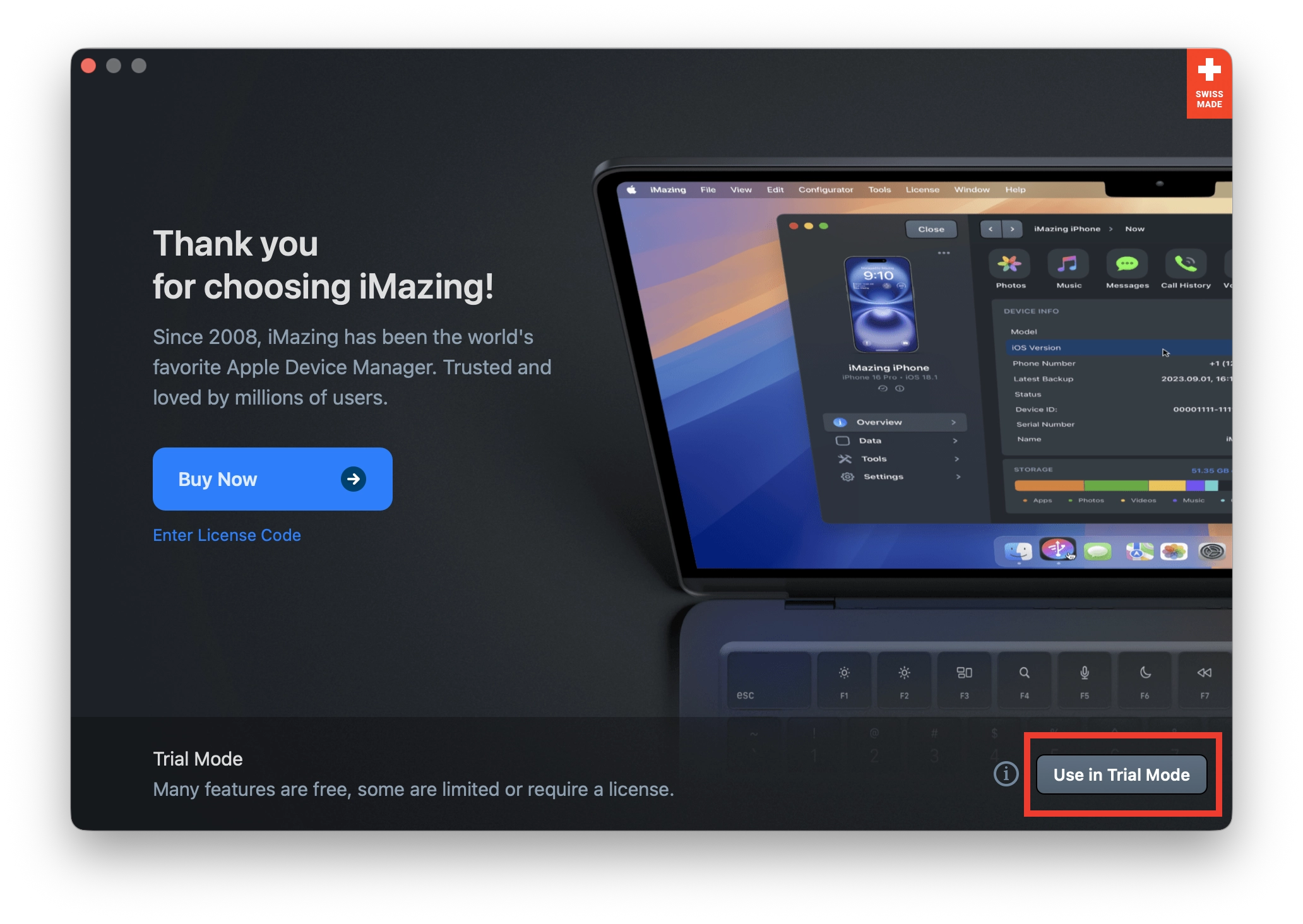 iMazing เป็นแอปแบบจ่ายเงิน แต่เราสามารถทดลองใช้งานได้ โดยคลิก Use Trial Version