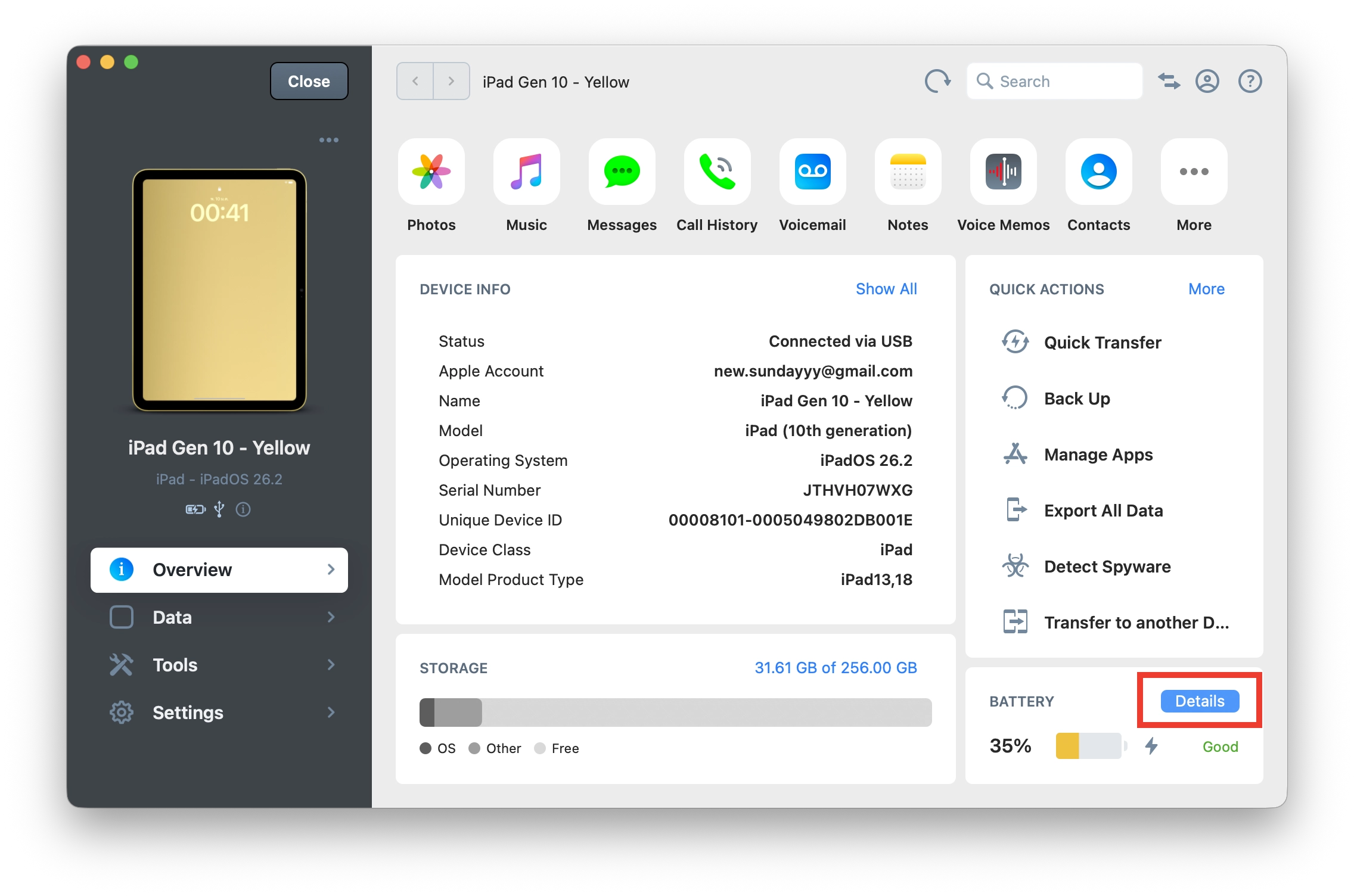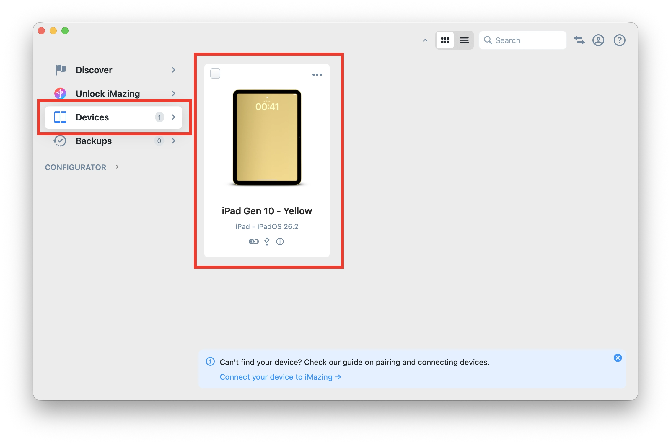 เปิดแอป iMazing > คลิก Devices > คลิก iPad ที่เชื่อมต่อ