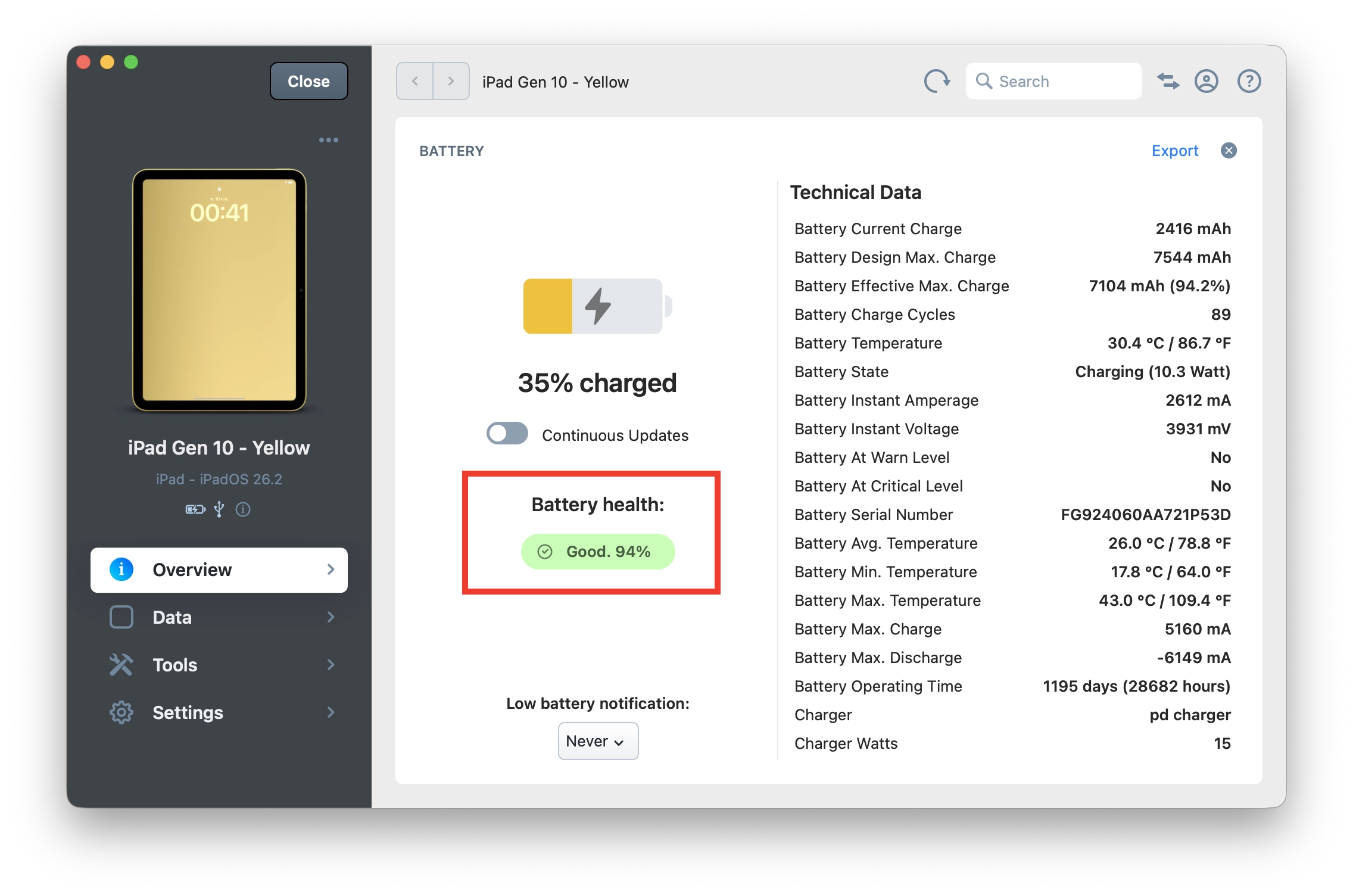 - ดาวน์โหลดแอปดูสุขภาพแบต iPad อย่าง coconutBattery หรือ iMazing