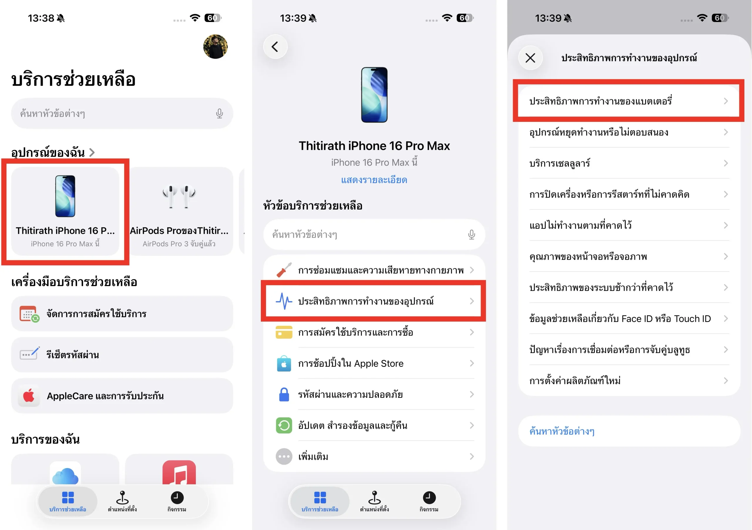 แตะ บริการช่วยเหลือ > เลือก iPhone รุ่นที่ต้องการตรวจสอบสุขภาพแบต > แตะ ประสิทธิภาพการทำงานของอุปกรณ์ > แตะ ประสิทธิภาพการทำงานของแบตเตอรี่
