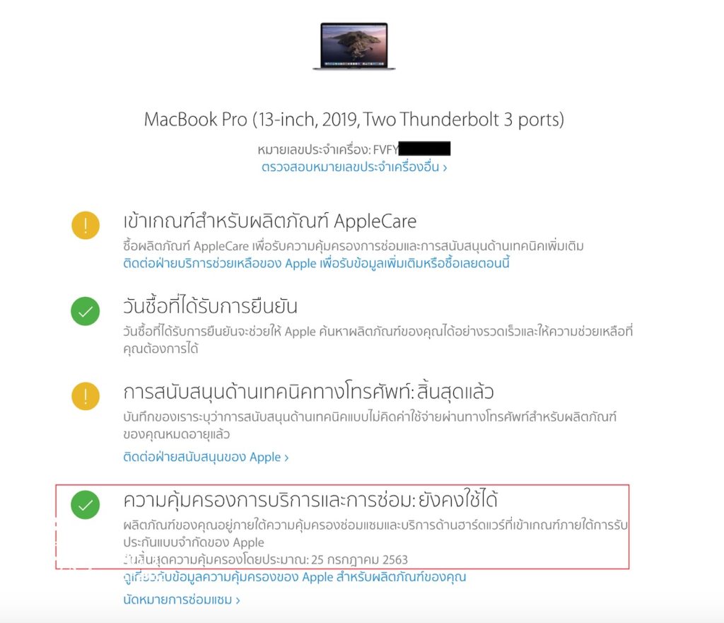 จากนั้นนำ Serial Number ไปวางที่เว็บ https://checkcoverage.apple.com/th/th/ แล้วเช็คความคุ้มครองส่วน ความคุ้มครองการบริการและการซ่อม ต้องเหลือ 1 ปีเต็มนับจากวันที่ซื้อ และการสนับสนุนด้านเทคนิคทางโทรศัพท์ 90 วัน