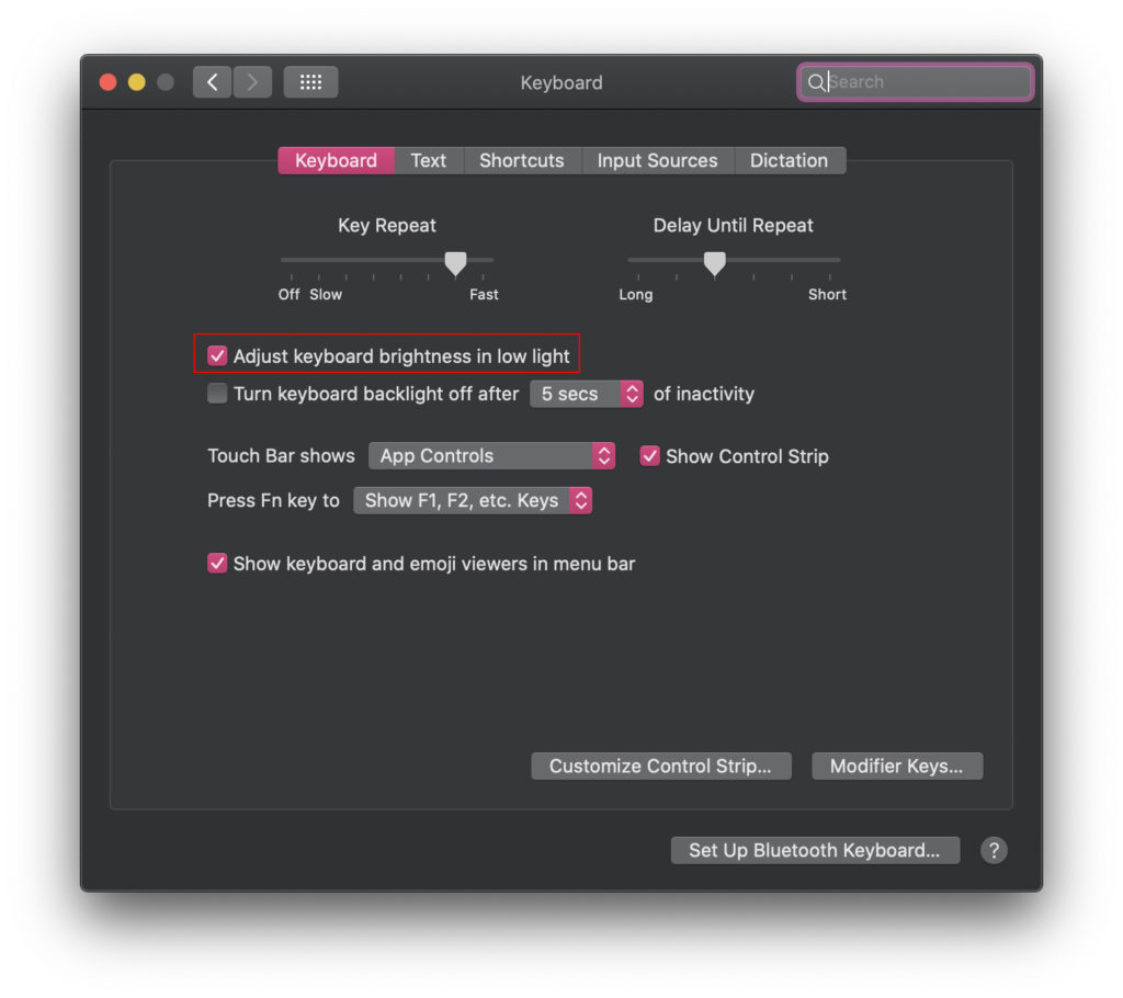 สามารถเช็คการตั้งค่าได้ที่ System Preferences > Keyboard > เปิด Adjust keyboard brightness in low light