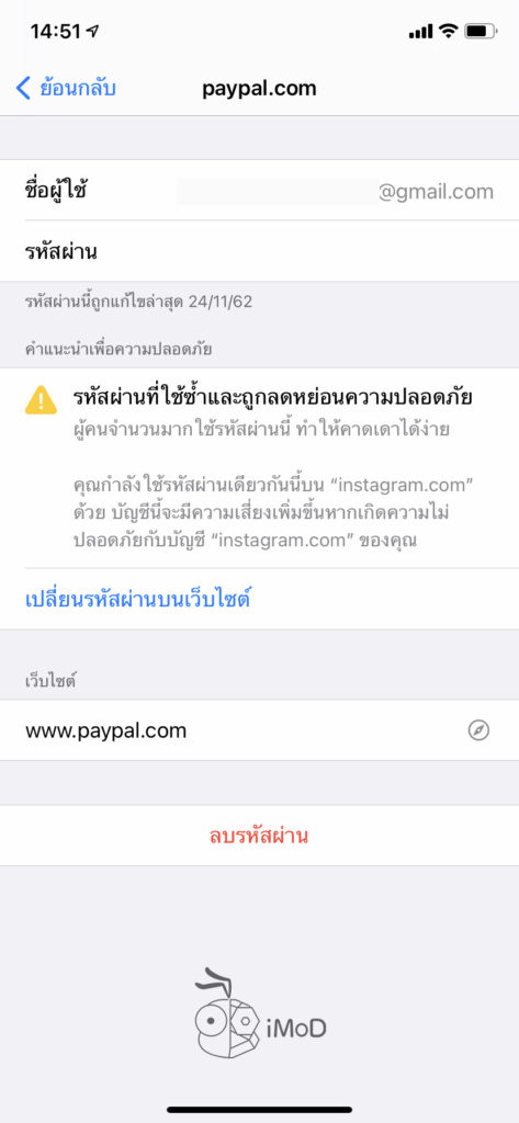 เมื่อแตะเข้าไปดูรายละเอียด เราก็จะเห็นคำแนะนำอย่างละเอียดว่ารหัสผ่านของเราไม่ปลอดภัยอย่างไร ดังตัวอย่าง เป็นรหัสผ่านที่ถูกใช้ซ้ำ คาดเดาได้ง่าย และมีการใช้ซ้ำกับเว็บอื่น ๆ ซึ่งส่งผลให้บัญชีไม่ปลอดภัย เราสามารถแตะ “เปลี่ยนรหัสผ่านบนเว็บไซต์” เพื่อเปลี่ยนรหัสผ่านใหม่ที่คาดเดาได้ยาก แนะนำให้เปลี่ยนทันทีถ้าอยู่ในความสำคัญสูง