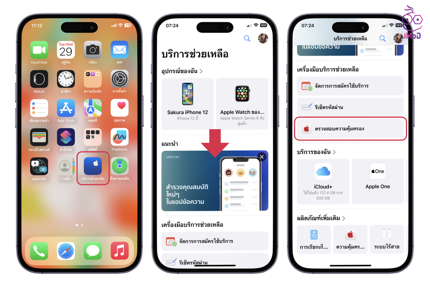 ไปที่แอป Apple Support > เลื่อนลงด้านล่าง > เลือกตรวจสอบความคุ้มครอง