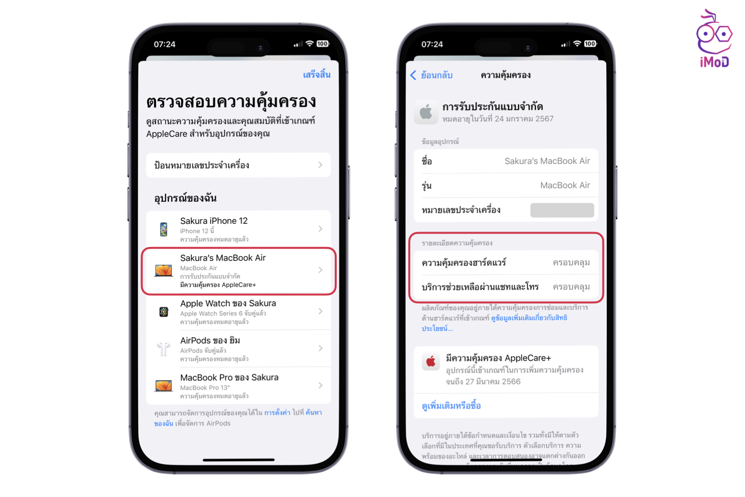 เราก็จะพบกับอุปกรณ์ Apple ที่เราใช้งานทั้งหมด ให้เลือกอุปกรณ์ที่ต้องการทราบข้อมูลการคุ้มครอง > ดูรายละเอียดความคุ้มครองได้เลย ถ้าหากอุปกรณ์อยู่ในประกัน จะแสดงว่า “ความคุ้มครองฮาร์ดแวร์: ครอบคลุม”