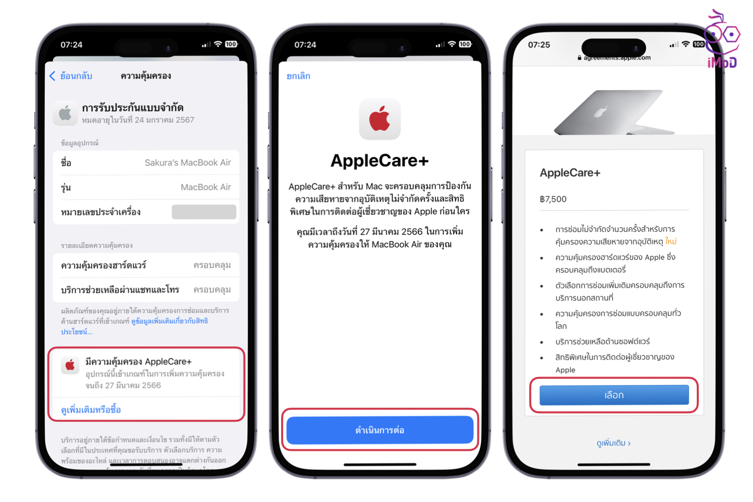 และถ้าหากเราซื้ออุปกรณ์มายังไม่ถึง 60 วัน ก็สามารถซื้อประกัน Apple Care+ เพิ่ม ซึ่งจะขยายความคุ้มครองเพิ่มอีก 2 ปีและรับประกันความเสียหายเพิ่มเติมได้ เช่น ความเสียหายที่เกิดจากอุบัติเหตุ โดยจะมีข้อมูลบอกไว้ว่าเราสามารถซื้อ Apple Care+ ได้ถึงวันที่เท่าไหร่ หลังจากซื้ออุปกรณ์มาแล้ว