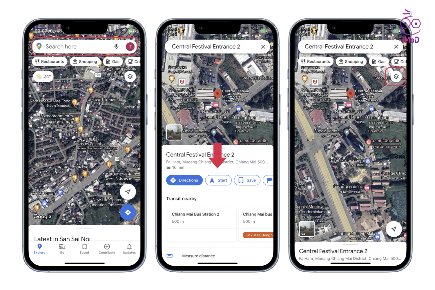 ไปที่แอป Google Maps > ป้อนสถานที่ที่เราต้องการเดินทางไป > ปัดรายละเอียดสถานที่ลงด้านล่าง > แตะไอคอนสี่เหลี่ยมเลเยอร์