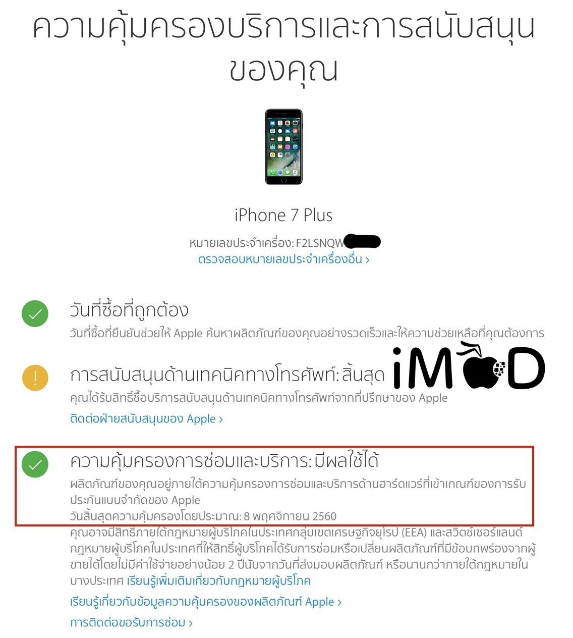 - มีผลใช้ได้ = เครื่องอยู่ในประกัน สามารถติดต่อเคลมกับ Apple หรือ AASP ได้
