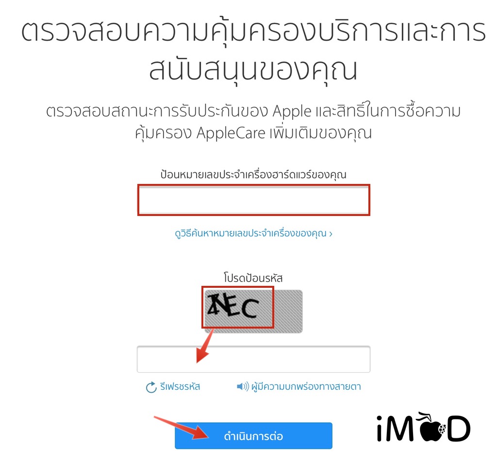 เข้าไปที่เว็บไซต์ https://checkcoverage.apple.com/th/th/ จากนั้นกรอกข้อมูล 2 ช่องคือ หมายเลขประจำเครื่อง(Serial Numner) หรือถ้า iPhone นั้นสามารถใช้ IMEI มาเช็คก็ได้ครับ และส่วนที่สองคือป้อนรหัสป้องกันบอต (ซึ่งรหัสนี้จะเปลี่ยนเรื่อยๆ พิมพ์ตัวเล็กหรือใหญ่ก็ได้เช่นกัน)