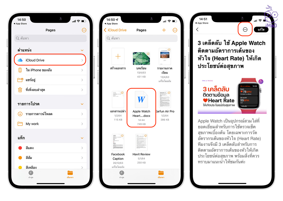 ไปที่แอป Pages > แถบเลือกหา ให้แตะ iCloud Drive (หรือถ้าไฟล์เก็บไว้ที่อื่นก็เลือกโฟลเดอร์อื่นได้เลย) > แตะไฟล์ .DOC ที่ต้องการแปลง > แตะไอคอน … ด้านบน