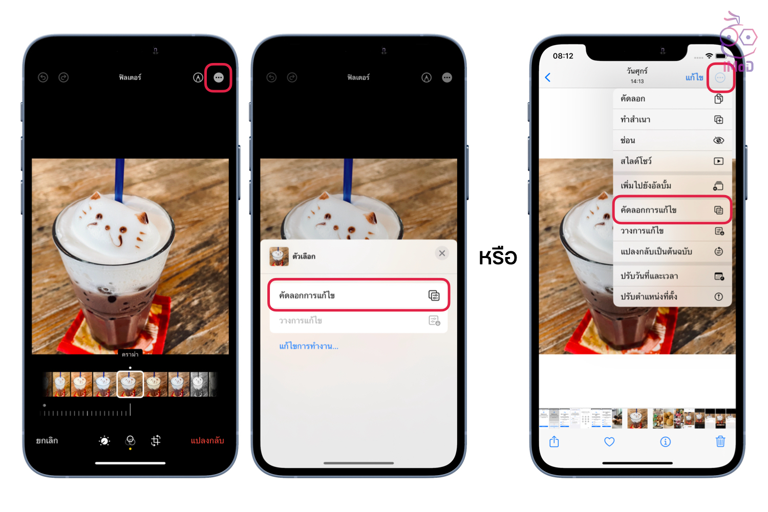 ปรับแต่งรูปภาพไม่ว่าจะเป็นการปรับแต่งแสง สีต่าง ๆ และฟิลเตอร์ เมื่อปรับแต่งเสร็จแล้ว ให้แตะไอคอน 3 จุดด้านบน แล้วเลือก คัดลอกการแก้ไข (Copy Edits) หรือจะมาคัดลอกที่ส่วนการแสดงรูปภาพก็ได้ ดังรูป