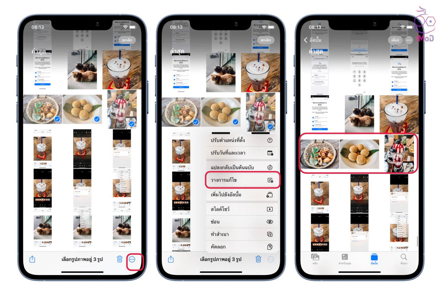 สำหรับการวางการปรับแต่งหลายรูปภาพพร้อมกันก็ทำได้ง่าย ๆ เลย เพียงแค่เลือกรูปภาพหลายรูปที่ต้องการ > แตะไอคอน 3 จุดด้านล่าง > แตะ วางการแก้ไข (Paste Edits) > ภาพที่เราเลือกก็จะถูกปรับแต่งเหมือนภาพที่คัดลอกมา