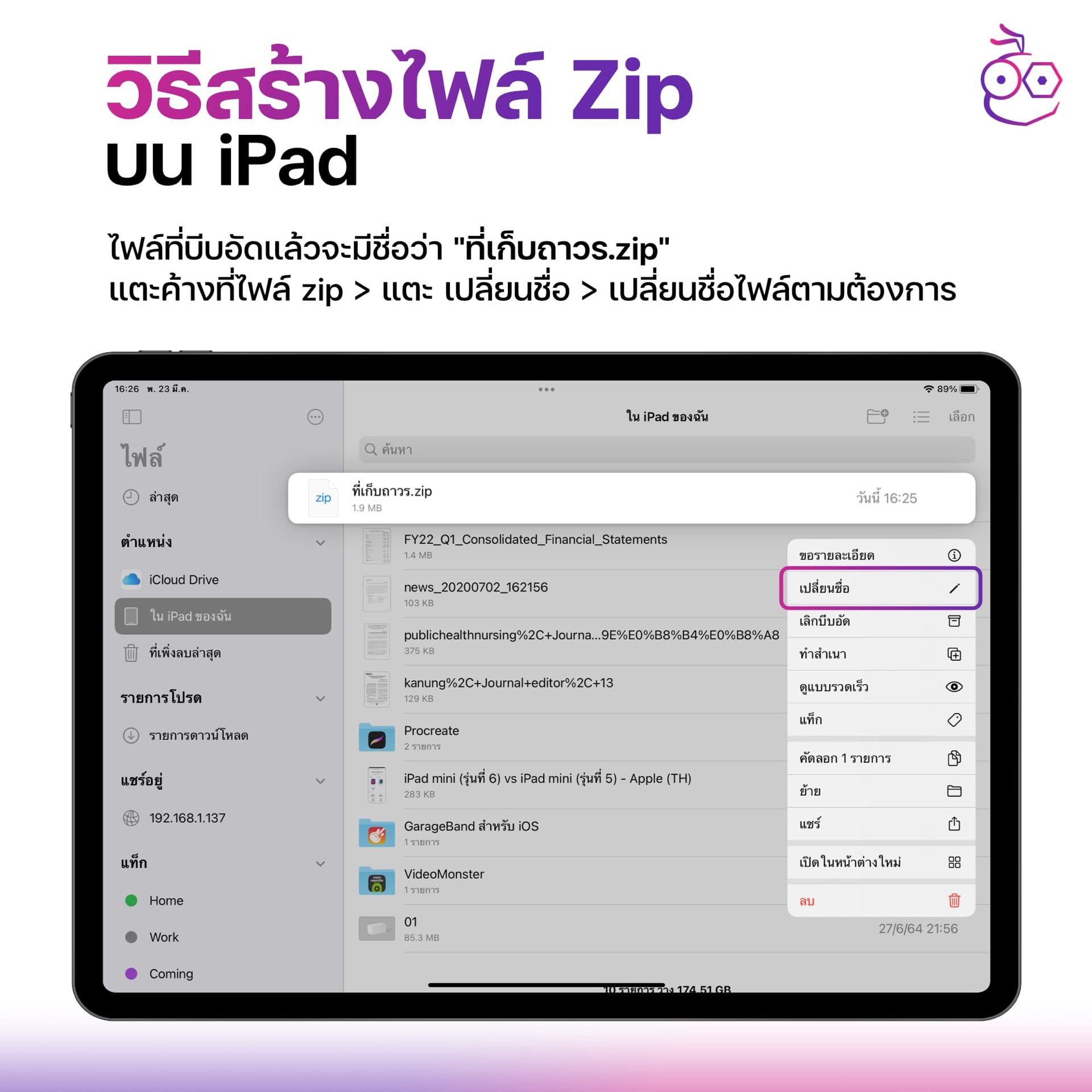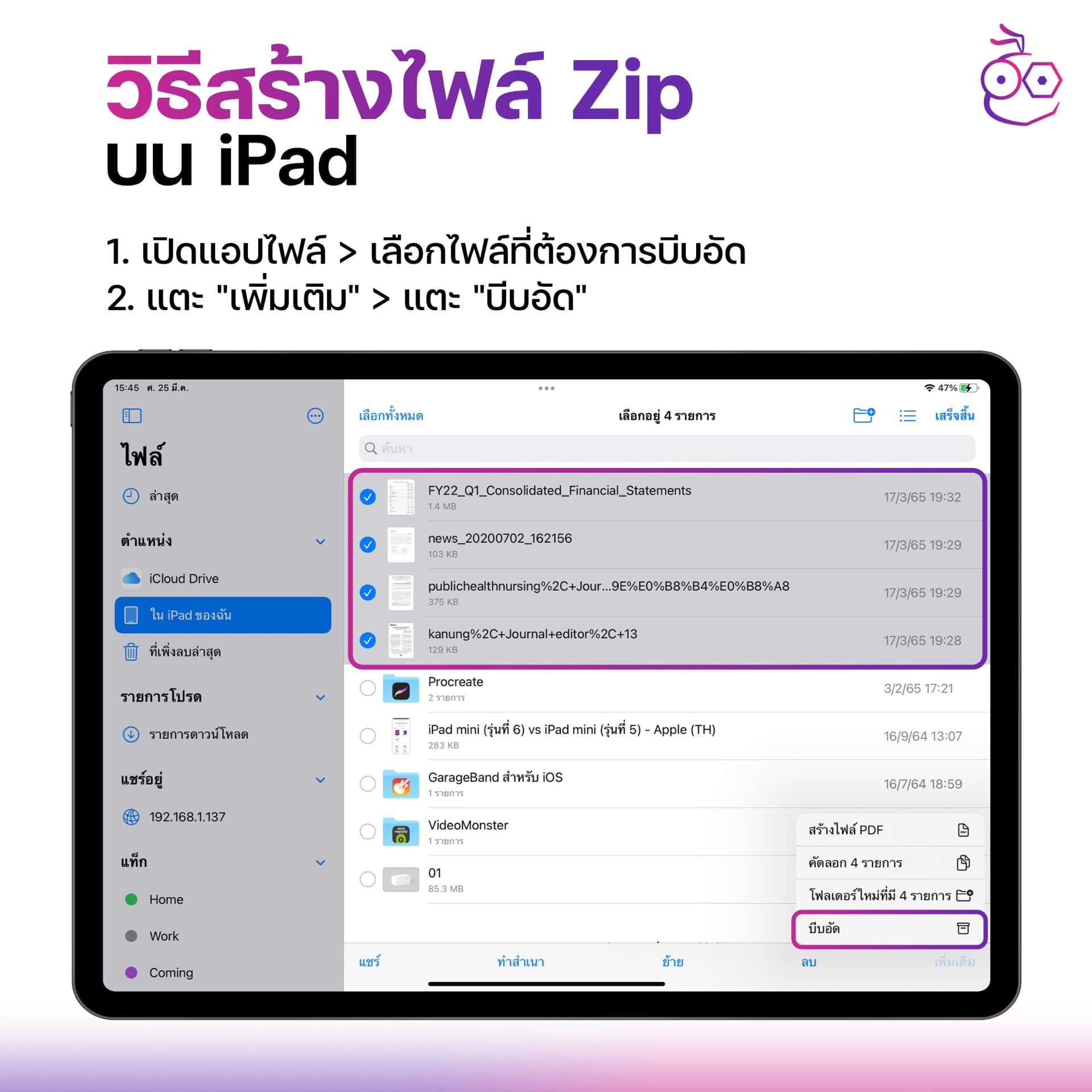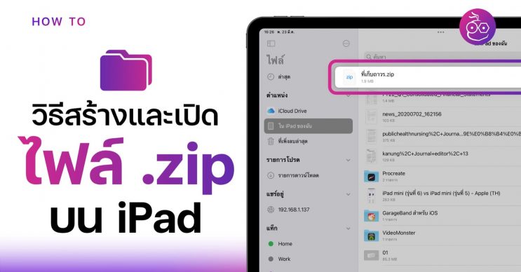 โดยการบีบอัดไฟล์ หรือการสร้างไฟล์ zip นั้นจะช่วยประหยัดพื้นที่จัดเก็บข้อมูล สามารถส่งไฟล์หลาย ๆ ไฟล์ได้ในครั้งเดียว และจะช่วยให้ส่งไฟล์ได้เร็วขึ้นเนื่องจากไฟล์มีขนาดเล็กลง ถ้าใครที่ใช้งาน iPad อยู่เป็นประจำอยู่แล้วนั้น วิธีนี้ตอบโจทย์แน่นอนไปชมกันเลย