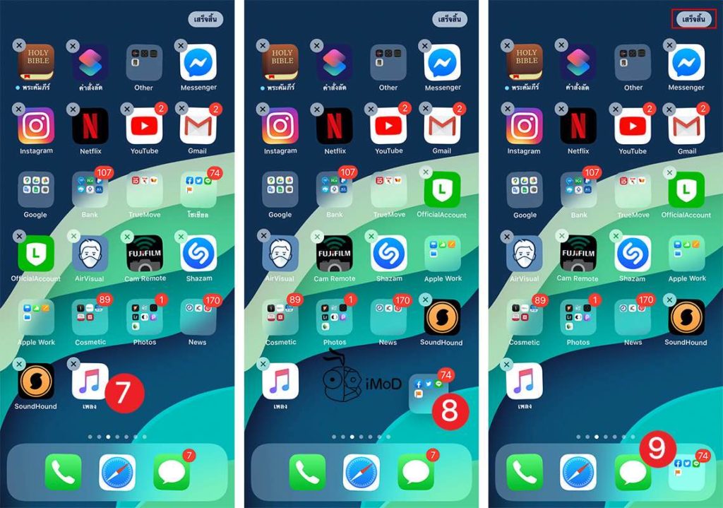 หลังจากวางแอปแล้ว ให้ลากโฟลเดอร์ที่เราสร้างมาวางในส่วนของ Dock แล้วแตะ เสร็จสิ้น (Done)