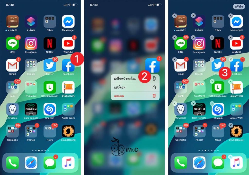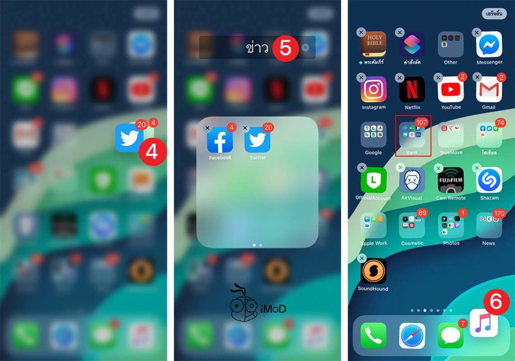 ลากแอปมาวางทับกันแล้วปล่อยนิ้ว > ตั้งชื่อโฟลเดอร์ แล้วแตะด้านนอกโฟลเดอร์ตรงไหนก็ได้ เพื่อออกมาหน้าโฮม เราก็จะได้โฟลเดอร์ที่สร้างขึ้นมา > จากนั้นแตะลากแอปที่ไม่ค่อยได้ใช้งานในส่วน Dock ลากออกมาวางบนหน้าโฮม