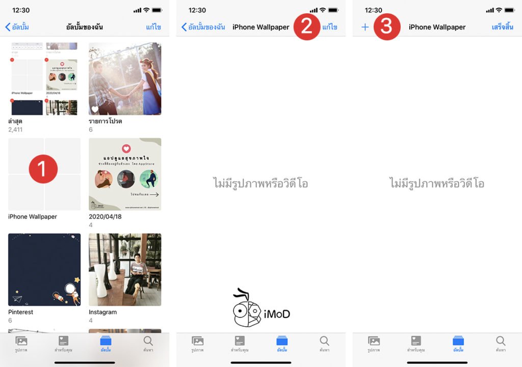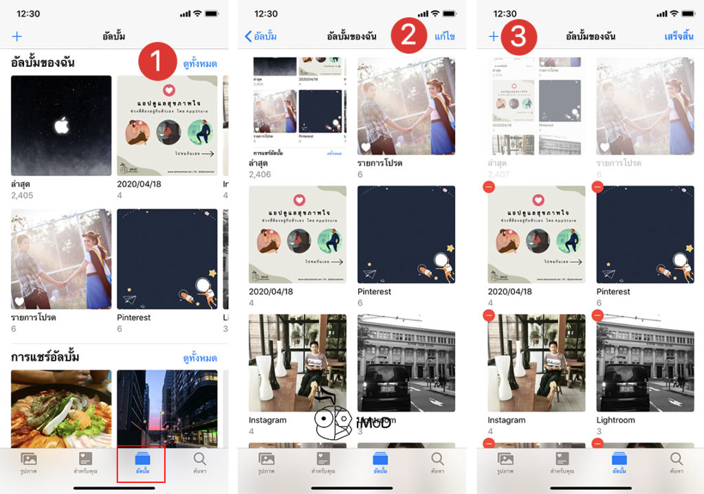ไปที่แอปรูปภาพ (Photos) > แตะแถบ อัลบั้ม (Albums) แล้วเลือก ดูทั้งหมด (See All) > แตะ แก้ไข (Edit) > แตะไอคอน +