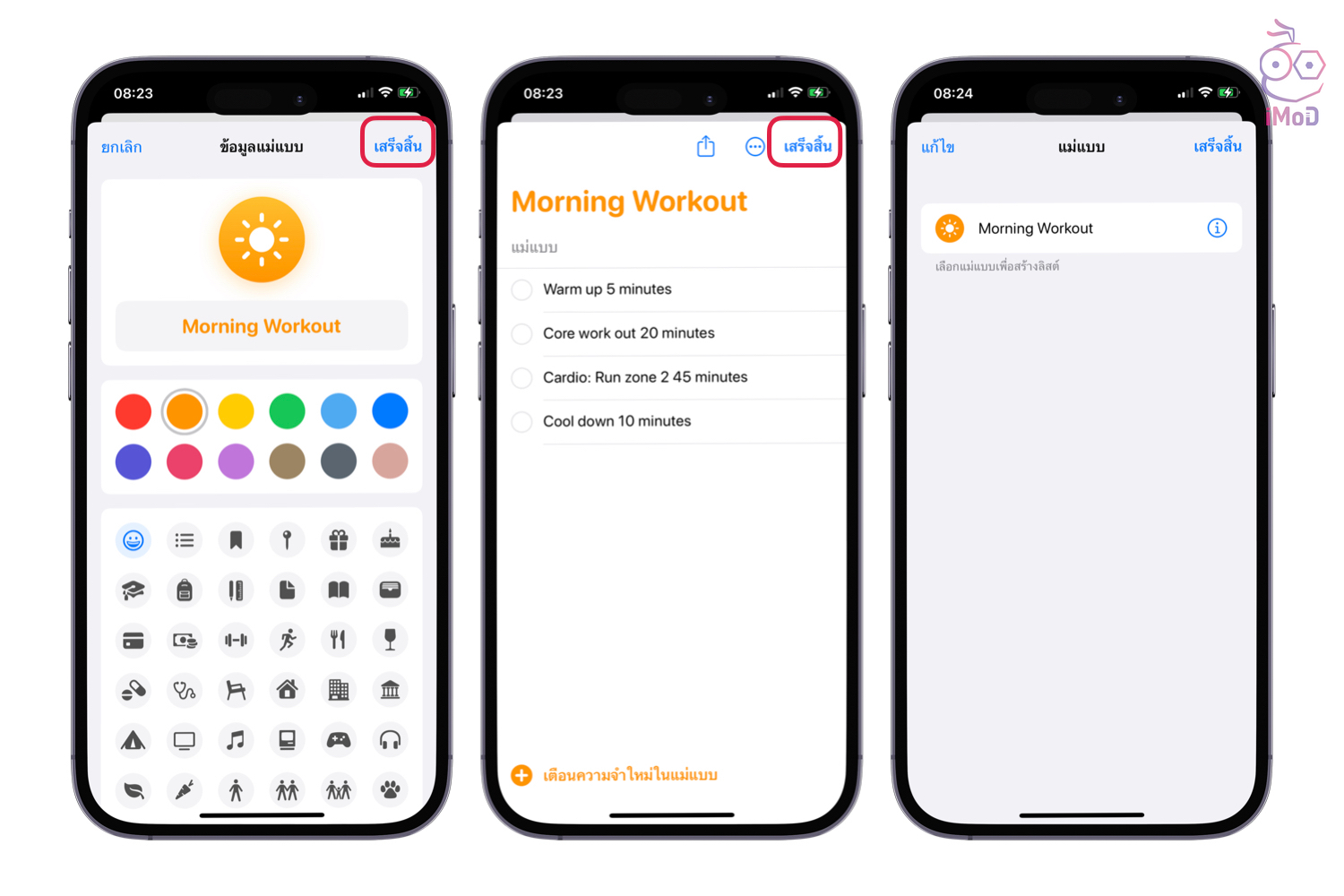 โดยเลือกสีและไอคอนแม่แบบใหม่ จากนั้นก็แตะเสร็จสิ้นได้เลย