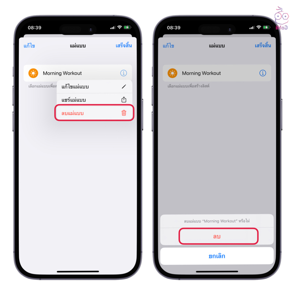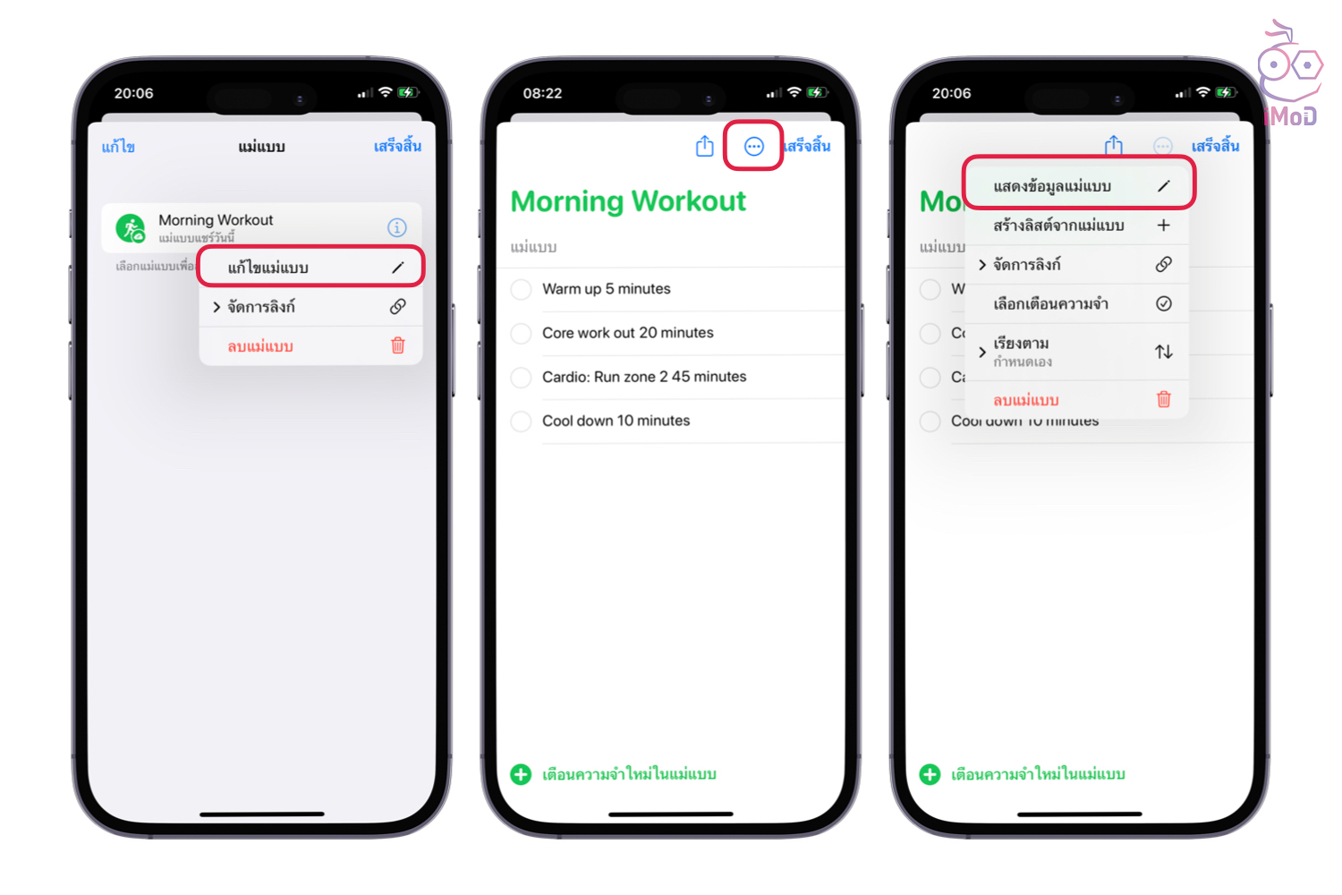 วิธีการแก้ไขแม่แบบ ก็สามารถแตะที่ไอคอน i ด้านหลังแม่แบบได้เลย > สามารถเพิ่มรายการเตือนความจำหรือปัดรายการเตือนความจำไปทางซ้าย เพื่อลบออกก็ได้ > หรือจะแตะไอคอน 3 จัดด้านบน เพื่อจัดการแม่แบบ ตัวอย่างเลือก จัดการการแสดงข้อมูลแม่แบบ