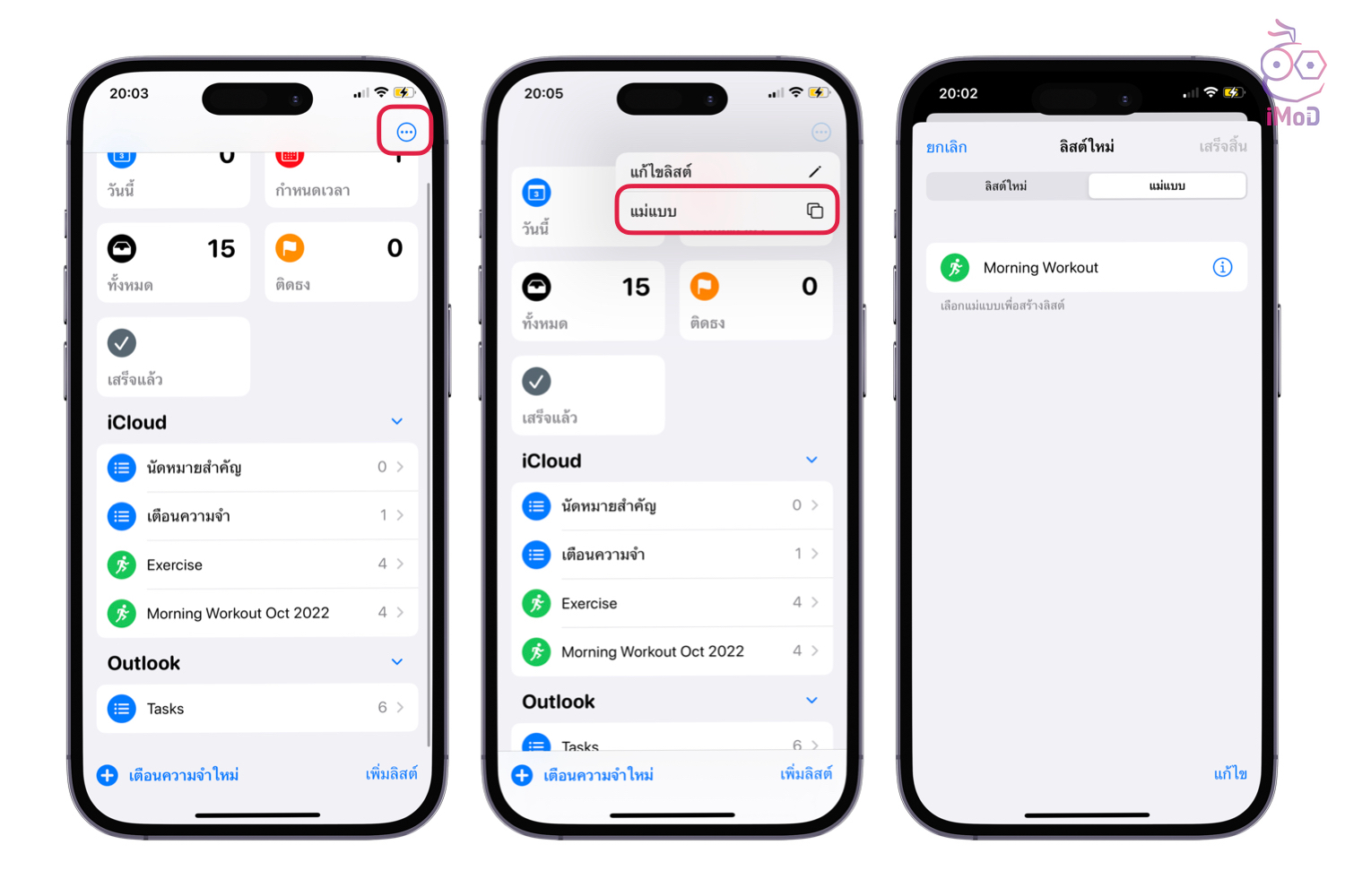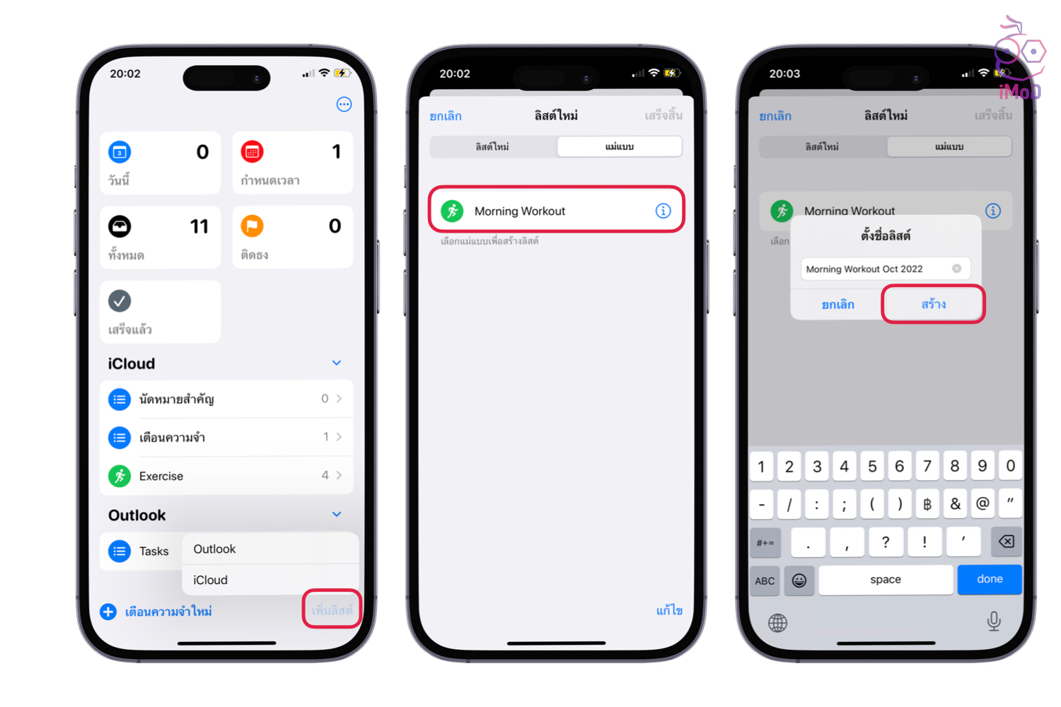 หลังจากที่เรามีแม่แบบแล้ว เมื่อเราต้องการสร้างลิสต์เตือนความจำใหม่โดยเลือกใช้แม่แบบที่มีอยู่แล้ว ก็แตะเพิ่มลิสต์ (Add List) ด้านล่าง แล้วเลือกที่จัดเก็บลิสต์ เป็น iCloud หรือแหล่งอื่น ๆ > แตะเลือกแม่แบบที่ต้องการ > ป้อนชื่อลิสต์ใหม่ แล้วแตะ สร้าง (Create)