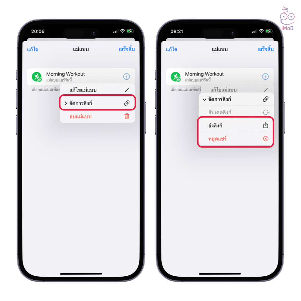 แม่แบบก็จะอยู่ในสถานะแชร์ เราสามารถแตะไอคอน i ด้านหลังแม่แบบ เพื่อส่งลิงก์ให้ผู้อื่น หรือจะหยุดแชร์ก็ได้