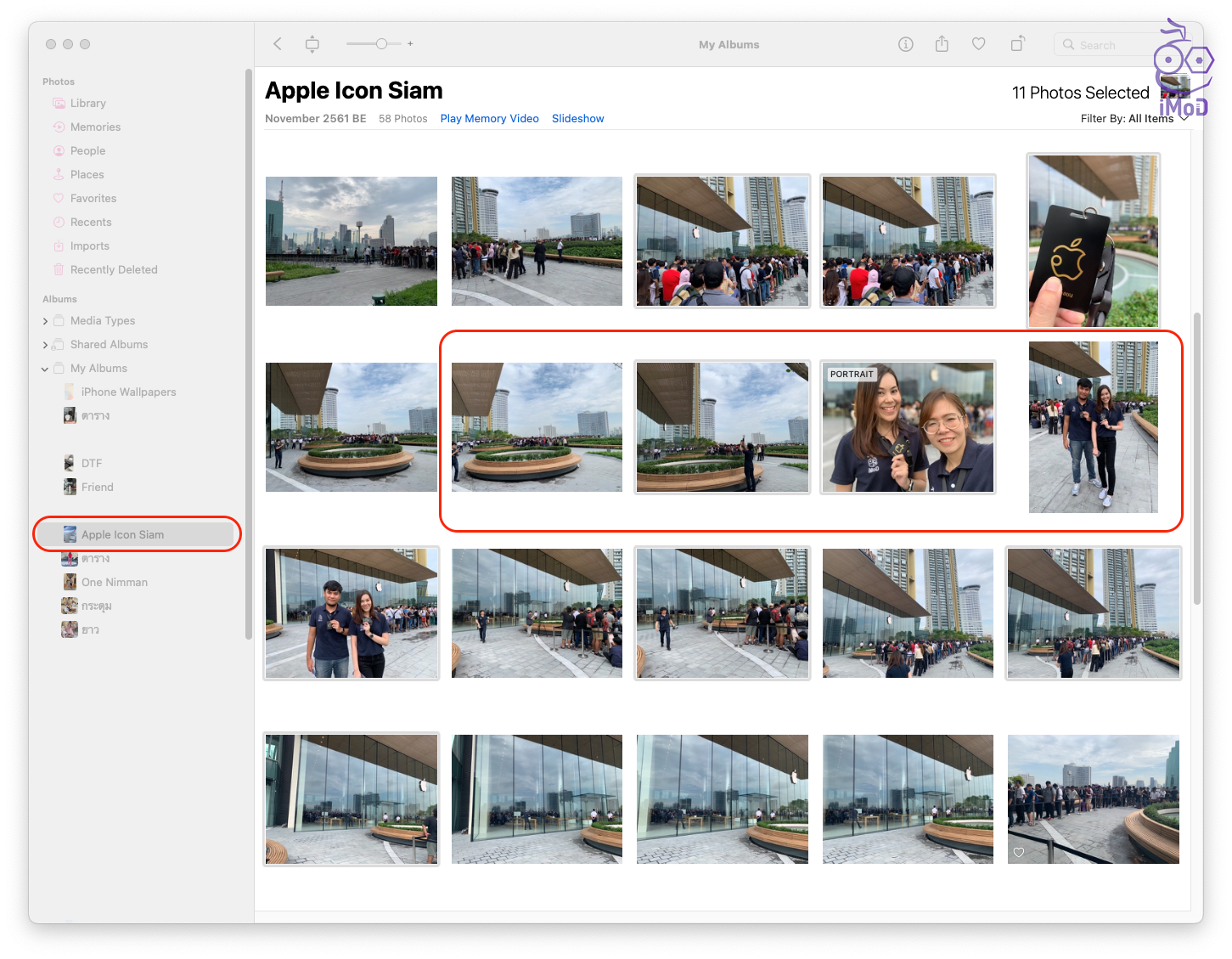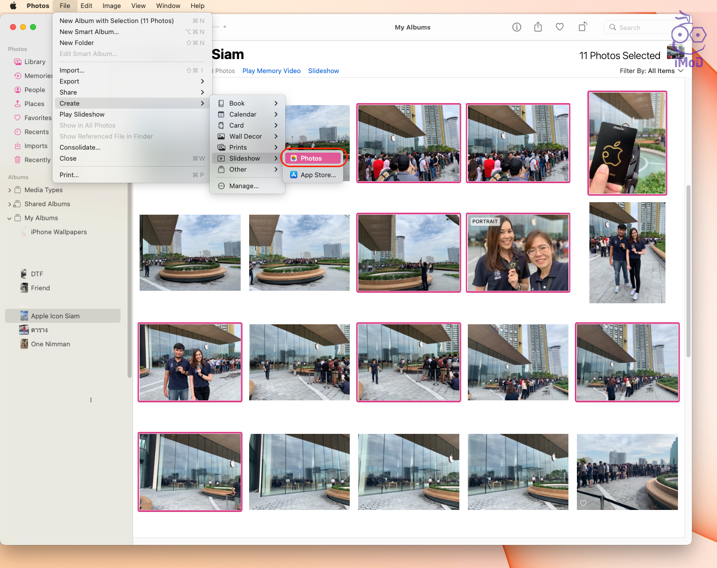 ไปที่แอปรูปภาพ (Photos) บน Mac แล้วเลือกอัลบั้มที่ต้องการ > เลือกรูปภาพที่ต้องการสร้างสไลด์โชว์