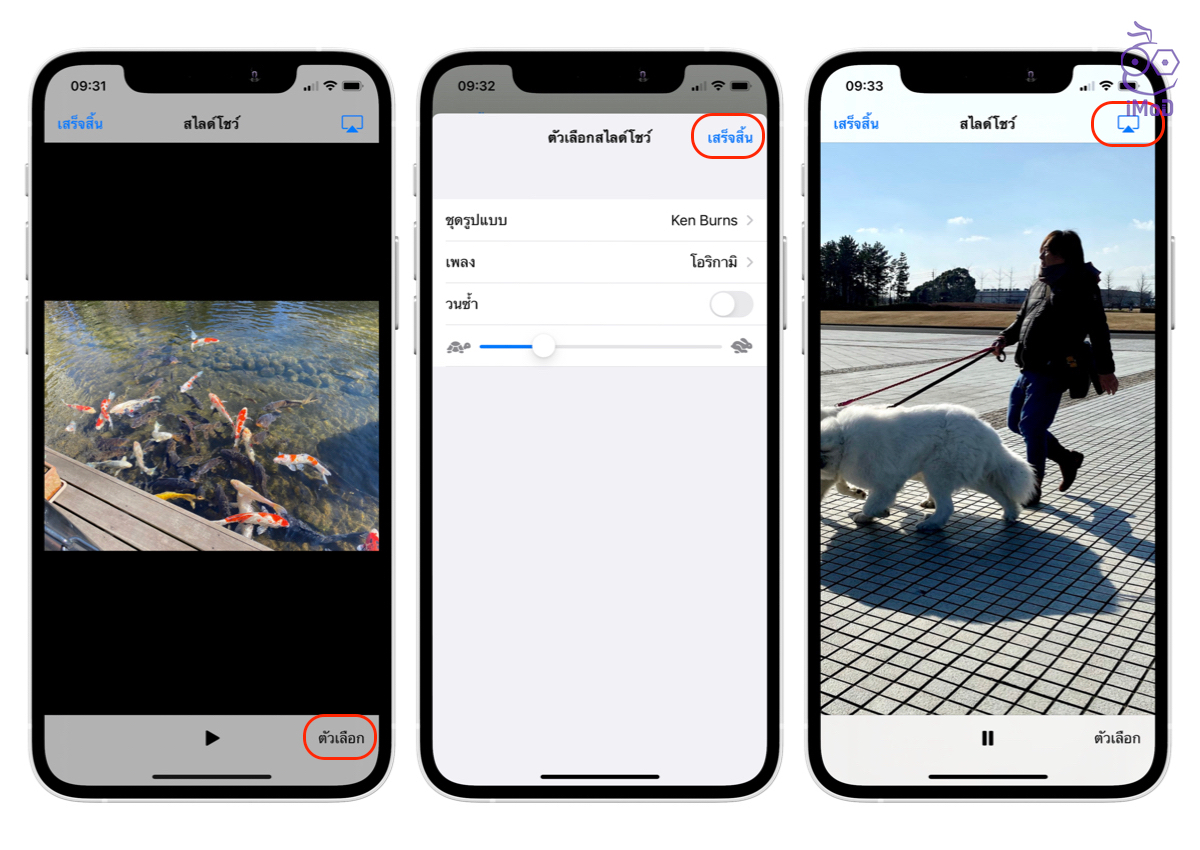 เมื่อเราได้สไลด์โชว์ (Slideshow) แล้ว ก็ AirPlay ขึ้นหน้าจอทีวีได้เลย รับชมพร้อมกับเพื่อน ๆ หรือคนในครอบครัวพร้อมกัน การสร้างสไลด์โชว์จาก iPhone และ iPad จะไม่สามารถบันทึกเป็นวิดีโอได้ จะทำได้เฉพาะ AirPlay อย่างเดียว
