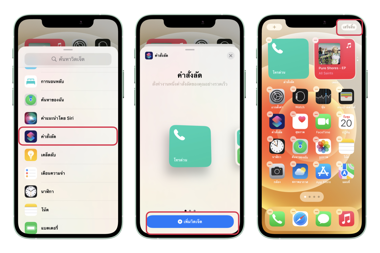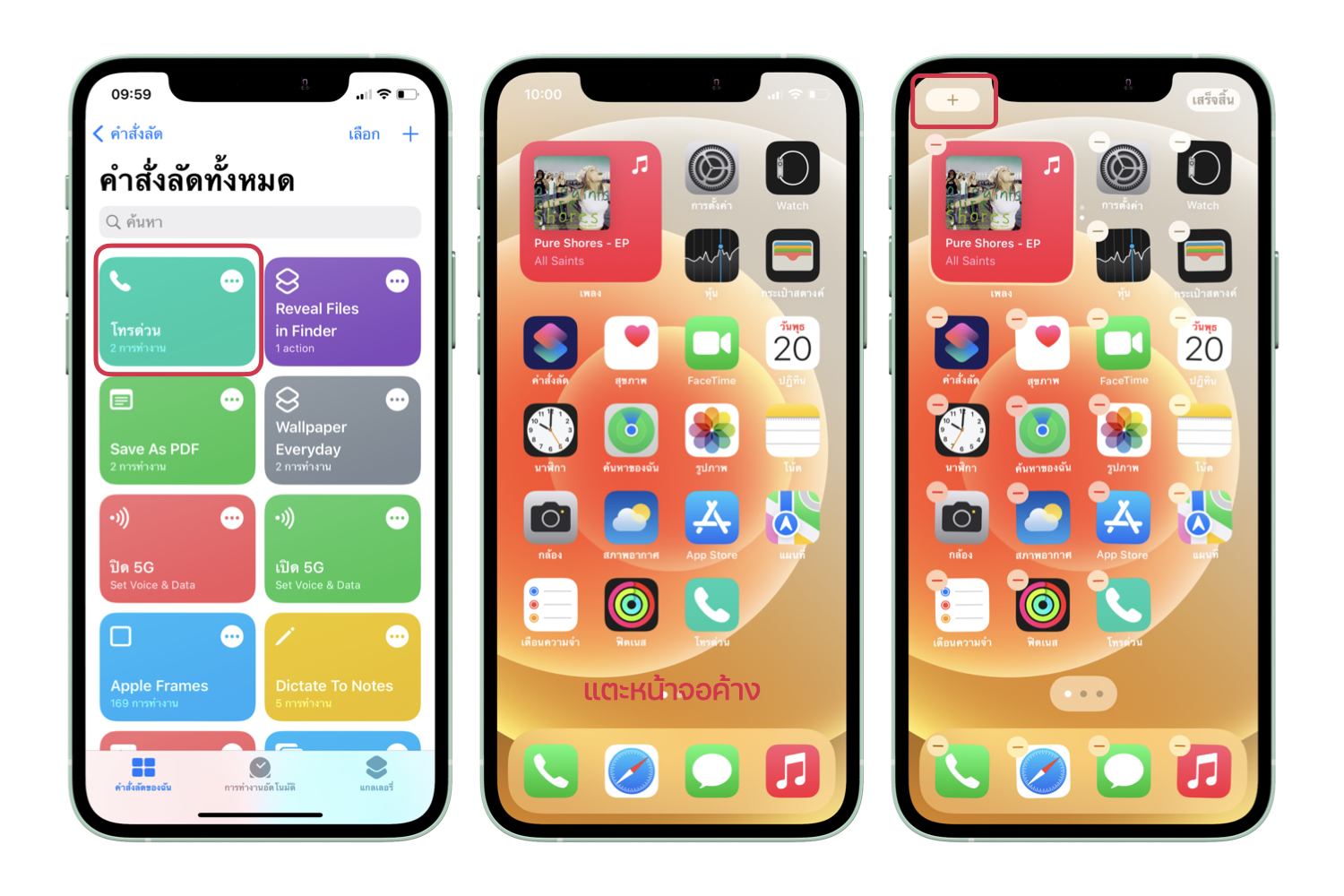 นอกจากนี้ ถ้าใครชอบแบบวิดเจ็ต เรายังสามารถเพิ่มคำสั่งลัดให้เป็นวิดเจ็ตบนหน้าโฮมได้ โดยให้คำสั่งลัดโทรด่วนอยู่อันดับแรกก่อน จากนั้นไปยังหน้าโฮม แล้วแตะค้าง > แตะไอคอน +