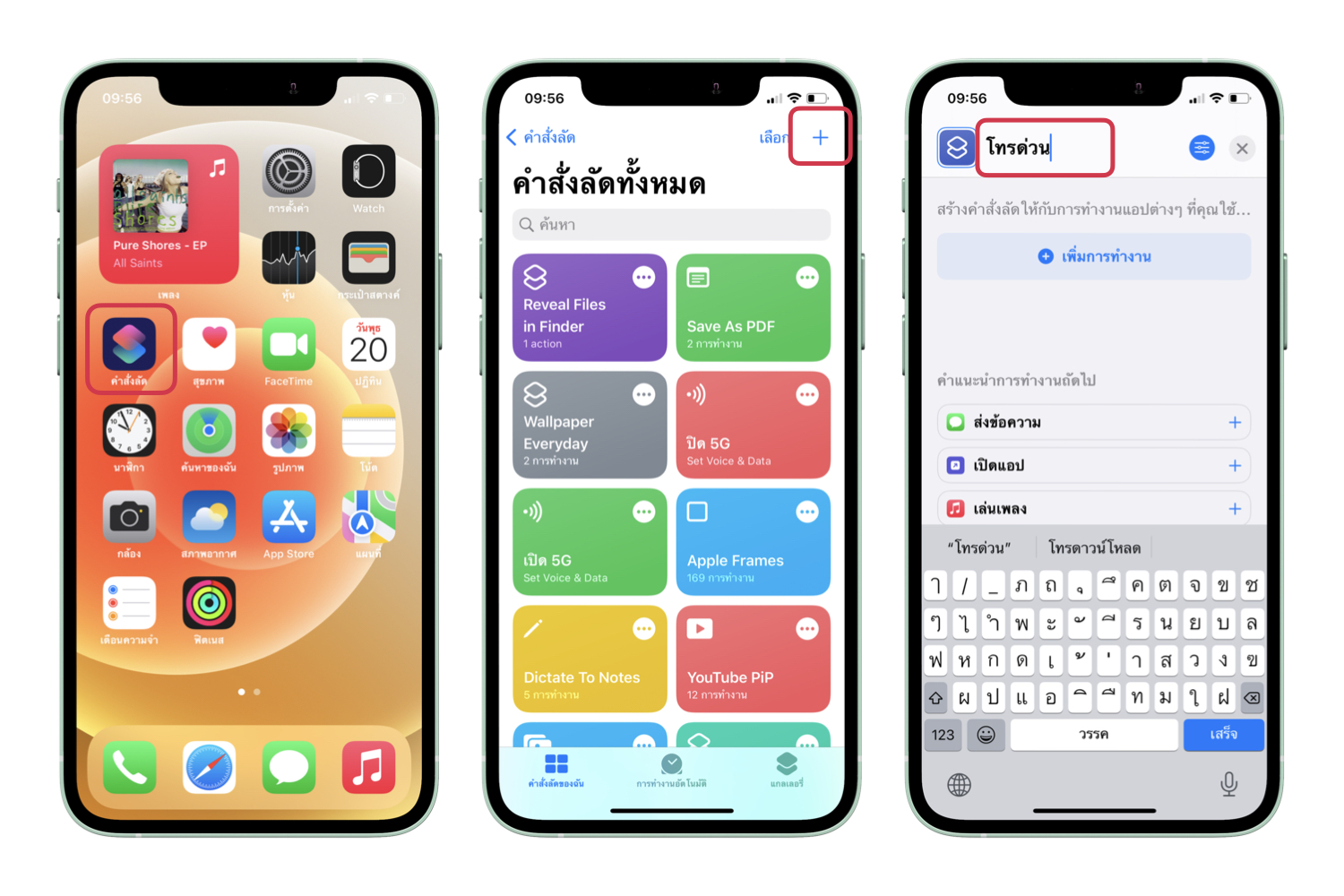 ไปที่แอปคำสั่งลัด (Shortcuts) > แตะไอคอน + > เปลี่ยนชื่อคำสั่งลัดเป็น โทรด่วน ด้านบน