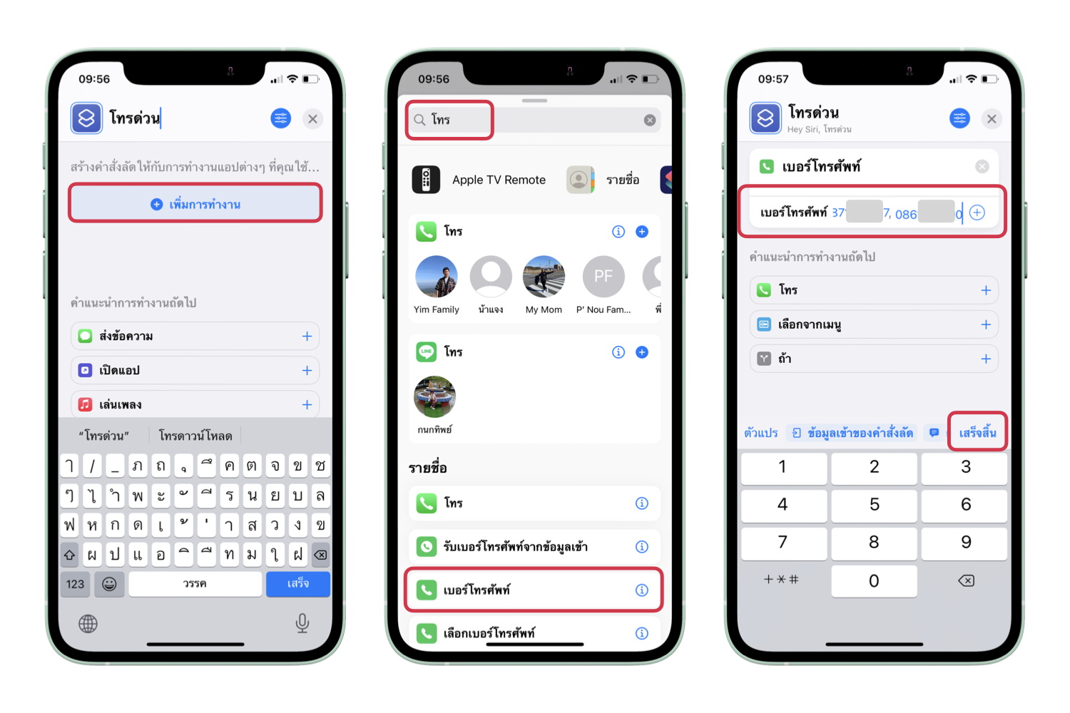 แตะ เพิ่มการทำงาน > ค้นหาด้วยคำว่า โทร > เลือก เบอร์โทรศัพท์ > ใส่เบอร์โทรศัพท์ที่เราโทรบ่อย จะใส่เบอร์เดียว หรือหลายเบอร์ก็ได้ หรือจะแตะไอคอน + ด้านหลัง เพื่อค้นหาจากรายชื่อที่มีอยู่ แล้วแตะ เสร็จสิ้น